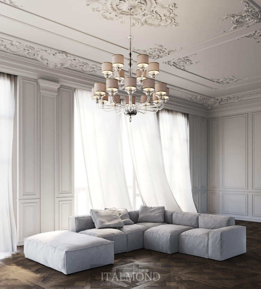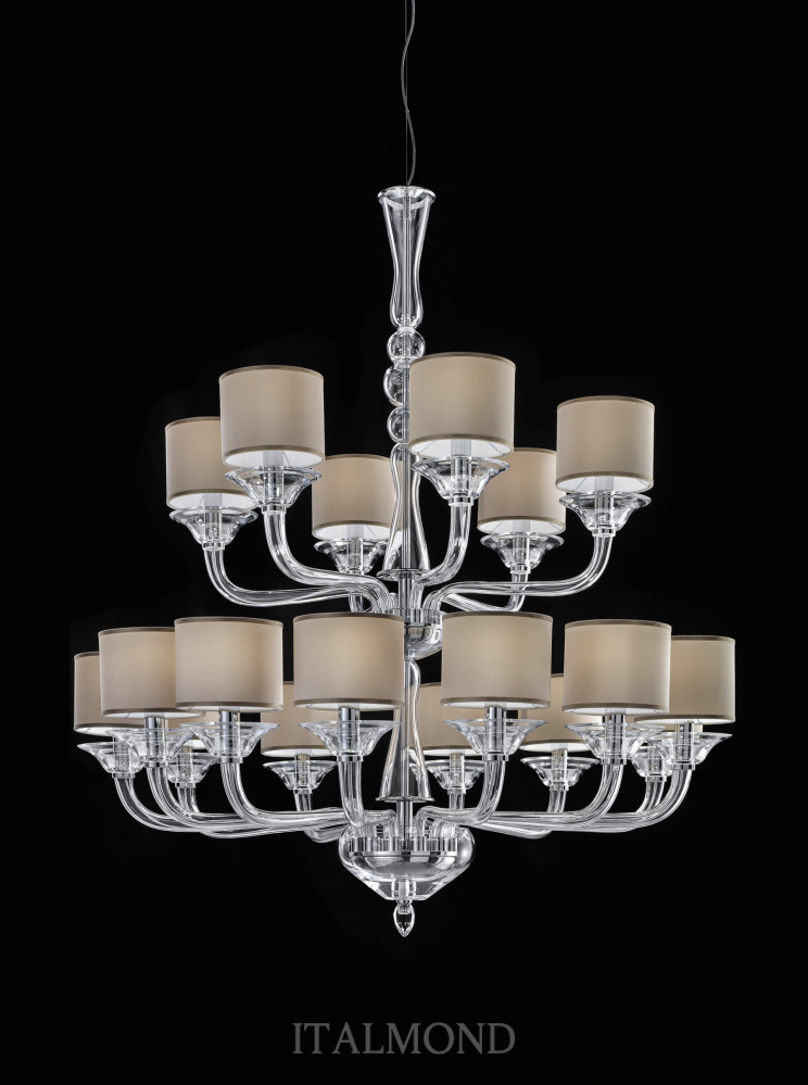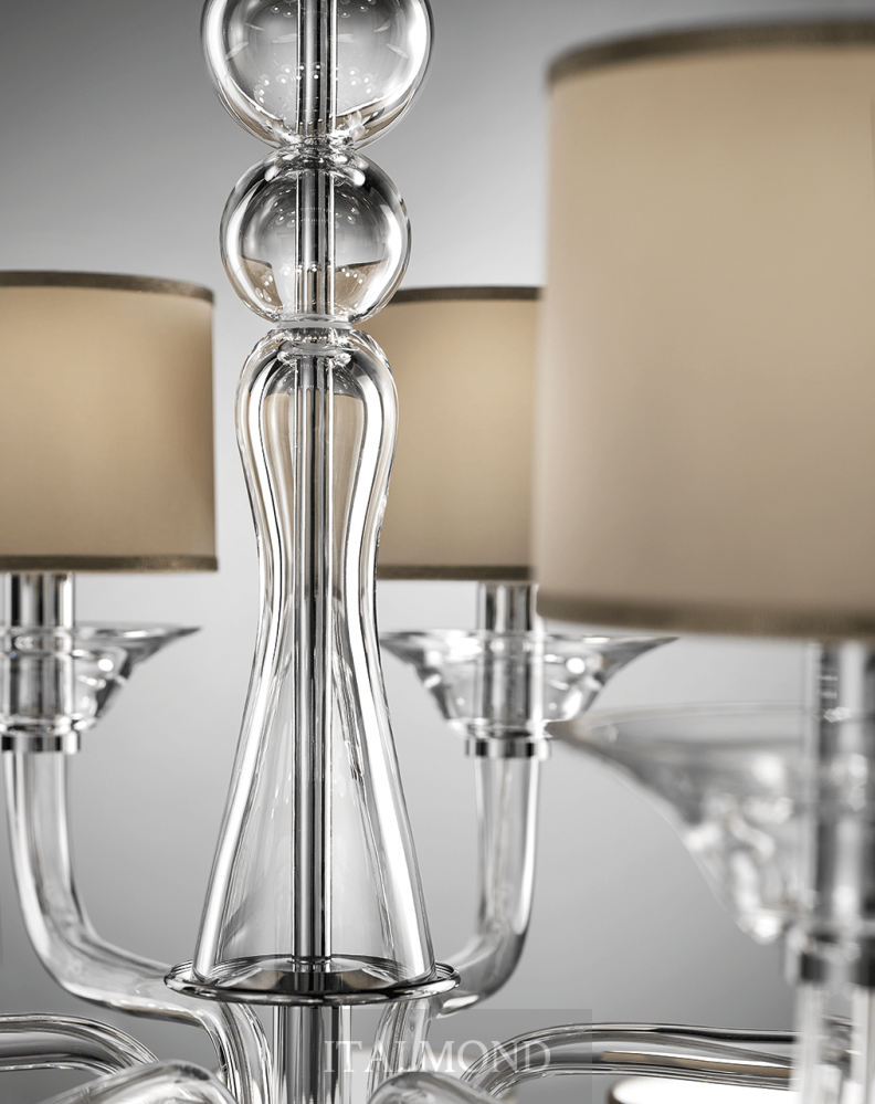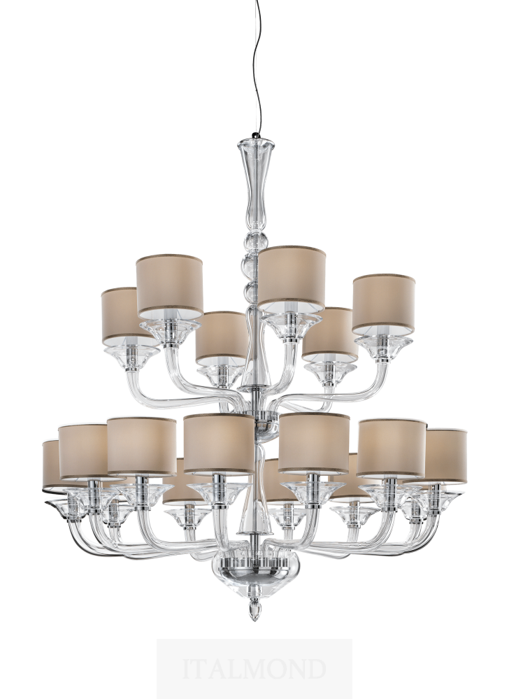 В каталоге бренда можно найти разные варианты отделки: прозрачное и цветное стекло, хрусталь, текстиль в цвете слоновой кости и других оттенках. Большой выбор декора позволяет найти идеальное решение для оформления гостиной, парадного зала или холла. Модель подойдет и для коммерческого помещения, в которых важно подчеркнуть премиальность обстановки.