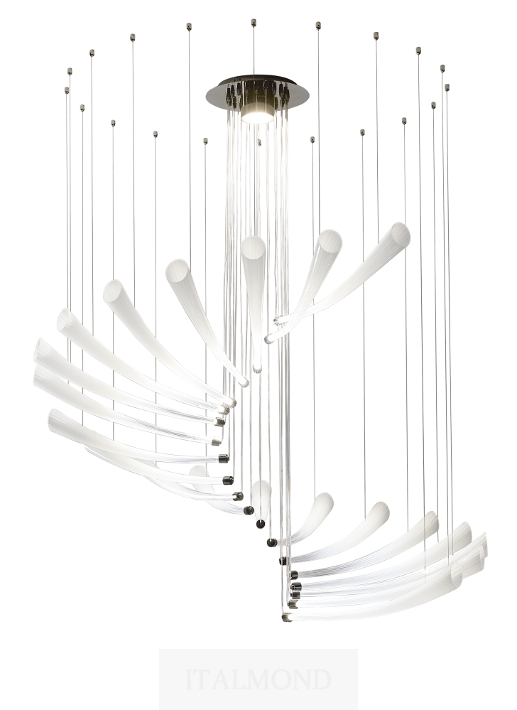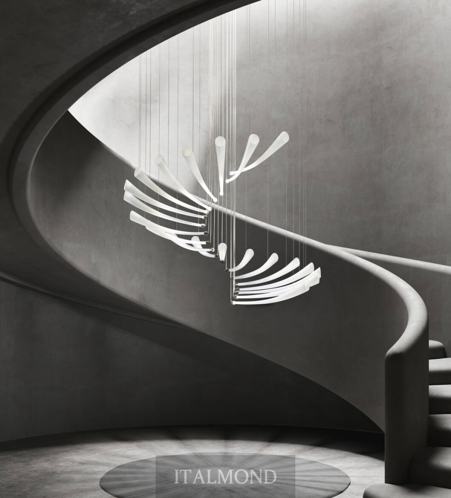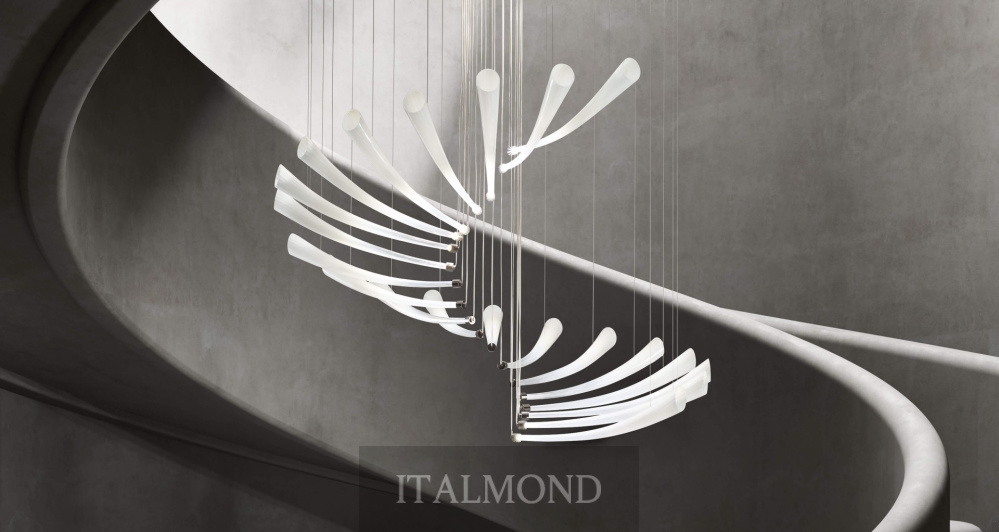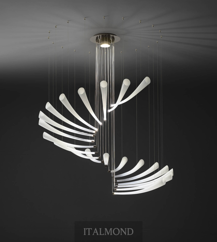 Люстра Italamp 439 Pulsa Spira — торжество динамики и света, запечатленное в сложной спиралевидной форме, напоминающей винтовую лестницу. Светильник, созданный по проекту итальянского дизайнера Данило де Росси, кажется живым организмом, пульсирующим в пространстве.