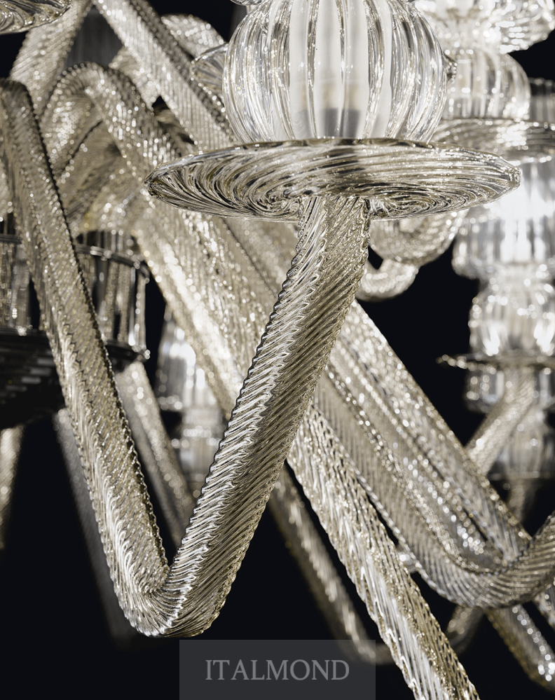 Люстра подчеркивает элитный характер интерьера, привнося в него атмосферу средиземноморского шика. Каркас светильника изготовлен из металла. Для декора используется стекло бронзового цвета или оттенка тикового дерева. Каждый элемент обработан вручную. За счет рифленой поверхности стекло изящно преломляет свет, создавая вокруг уникальный эффект из бликов и тени. Плафоны и покрытие каркаса изготовлены из стекла с высоким содержанием свинца.
