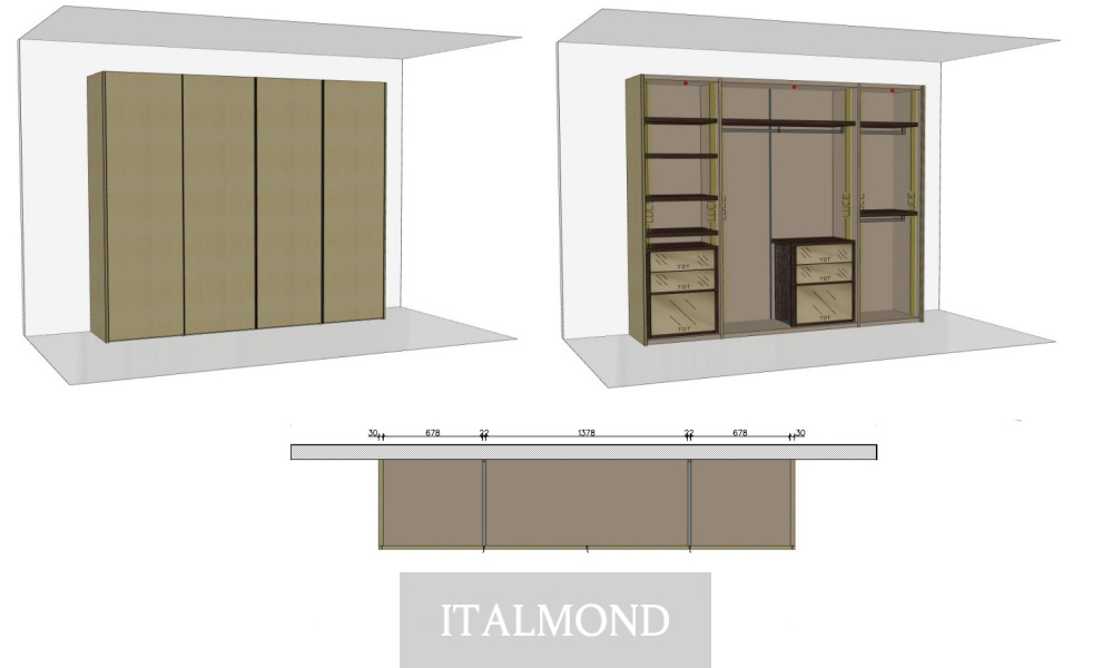 - Цвет и декор:корпус снаружи - металлизированный лак Champagne L.Metallico, корпус внутри - меламин Borgogna 522 + матовый лак Corda Opaco, фасады внутренних ящиков стекло Vetro Metallizzato Bronzo металл ручки - Titanio Opaco