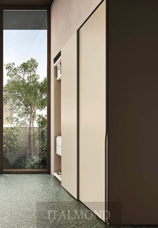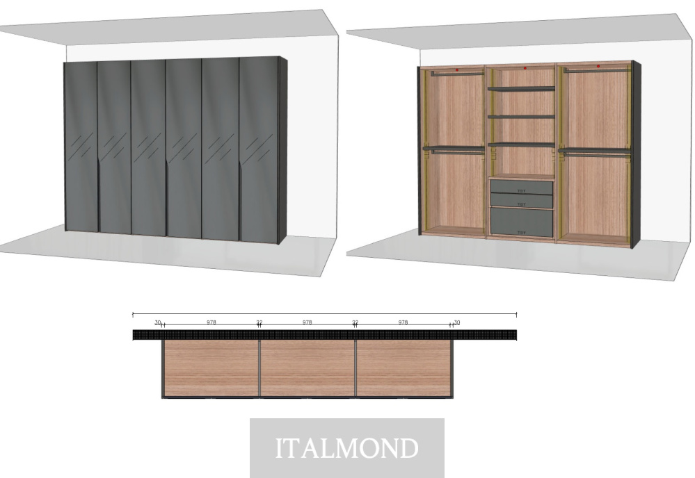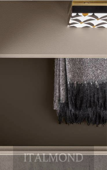 - Цвет и декор:корпус внутри - Materico Noce Dorato,корпус снаружи - матовый лак Ardesia Opaco, фасады - стекло Vetro Metallizato Piombo , встроенная ручка - металл Metallo Titanio Lucido