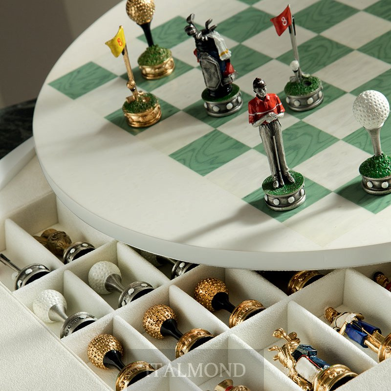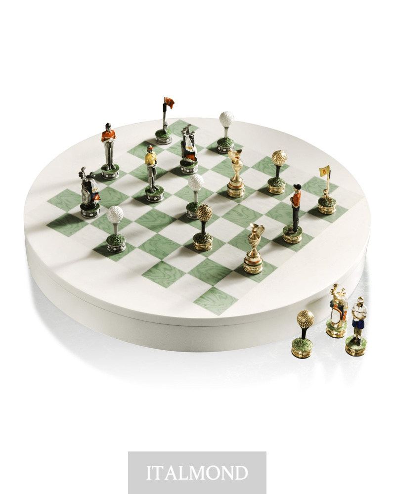 - Цвет и декор: Доска выполнена из белого и зеленого клена. Шахматные фигуры Гольф из латуни ручной росписи.