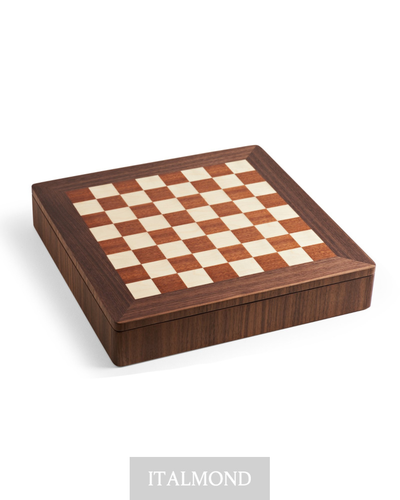 - Цвет и декор:Доска из орехового дерева Каналетто и белого клена в матовой отделке. Шахматные фигуры из самшита.