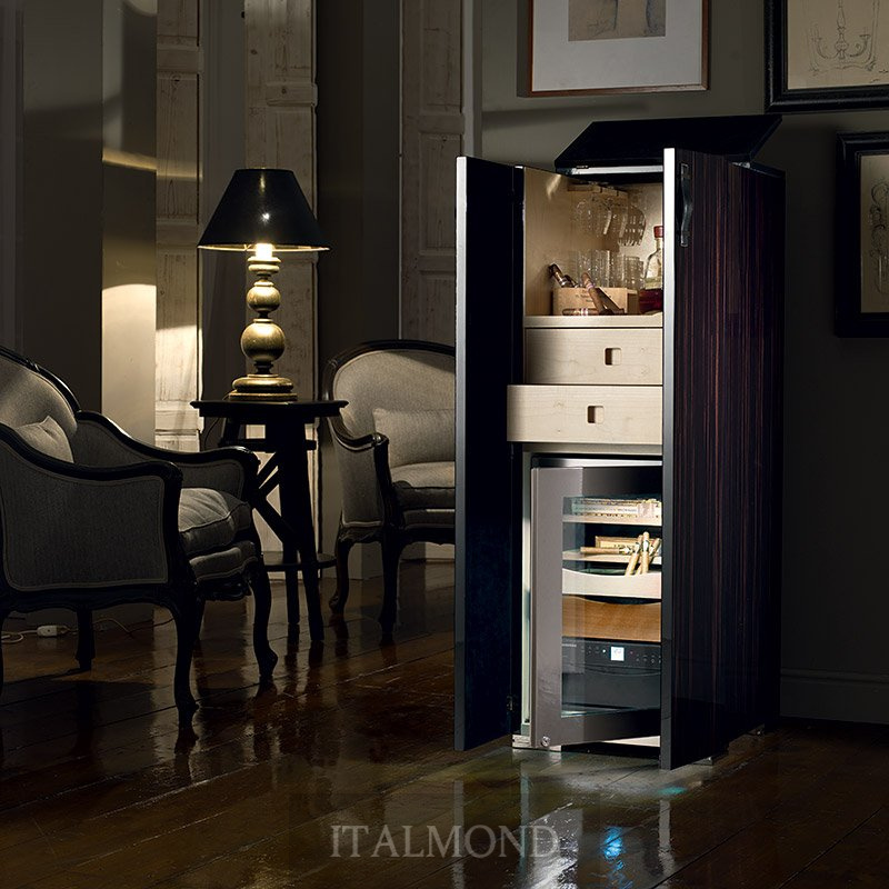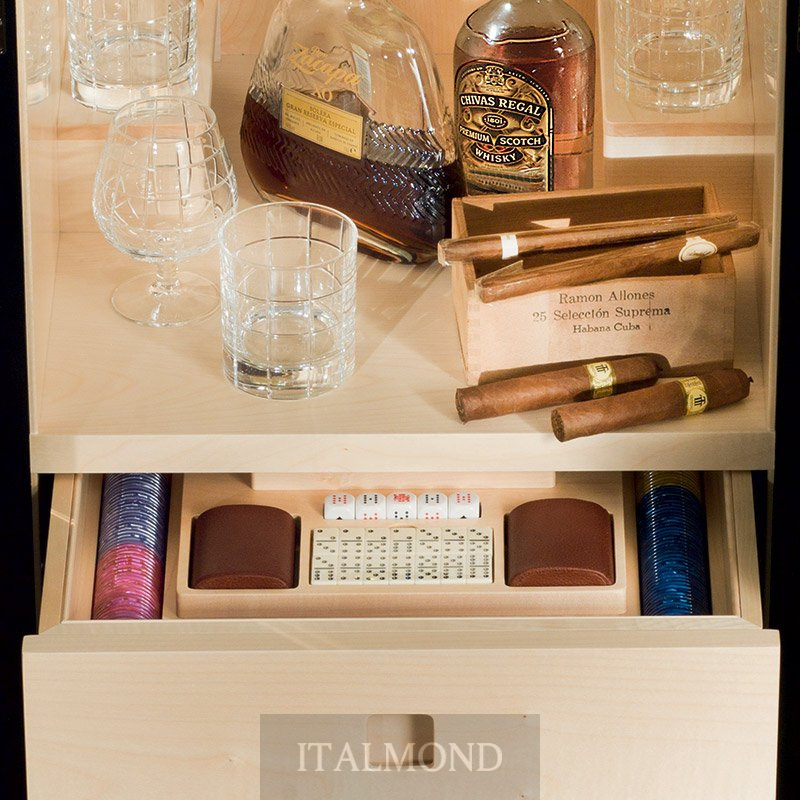 - Цвет и декор:Шкаф полированный из эбенового дерева с двумя дверками и крышкой. Ручки кожаные. Детали выполнены из отделанной рутением латуни. Содержит: электронный увлажнитель LIEBHERR для 500 сигар, 4 бокала для коньяка и 4 хрустальных бокала для Whisky, ручная гравировка, 24% свинец. Фишки для покера, игральные карты, кости и кожаные стаканы. Внутри он выполнен из клёна.