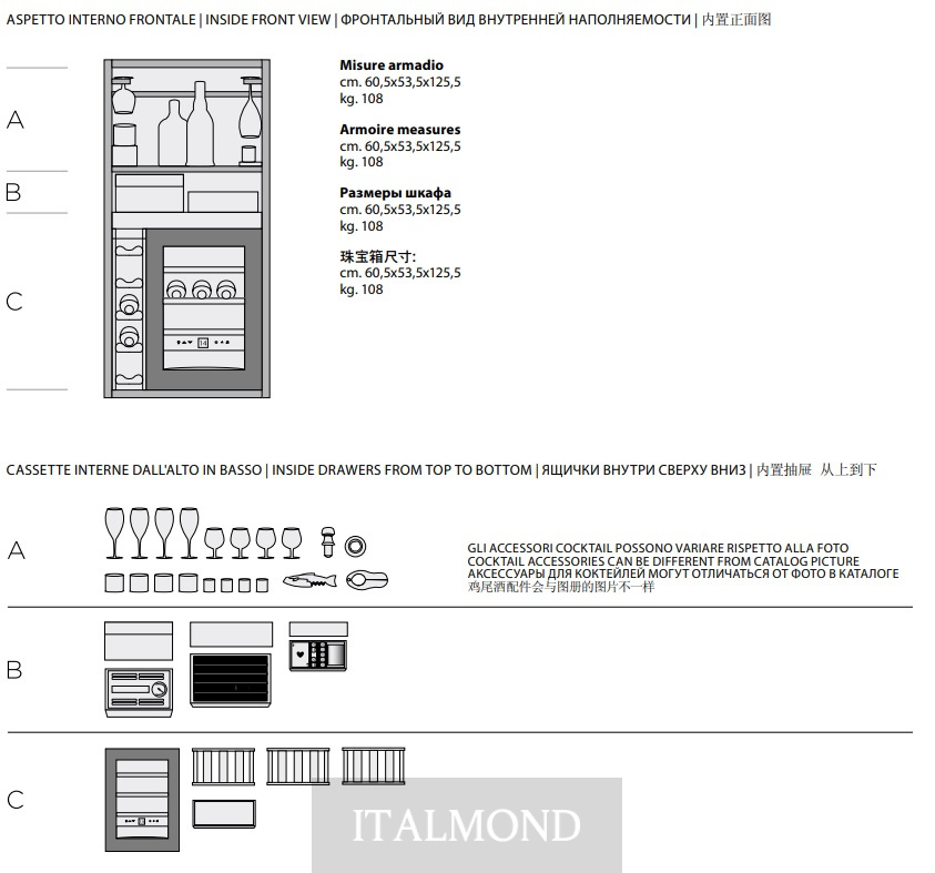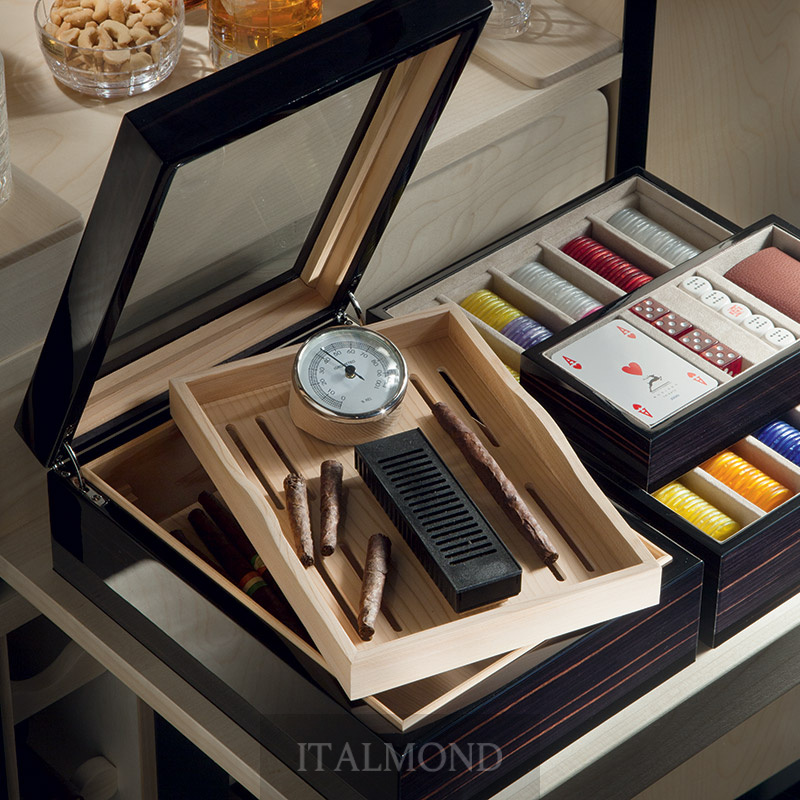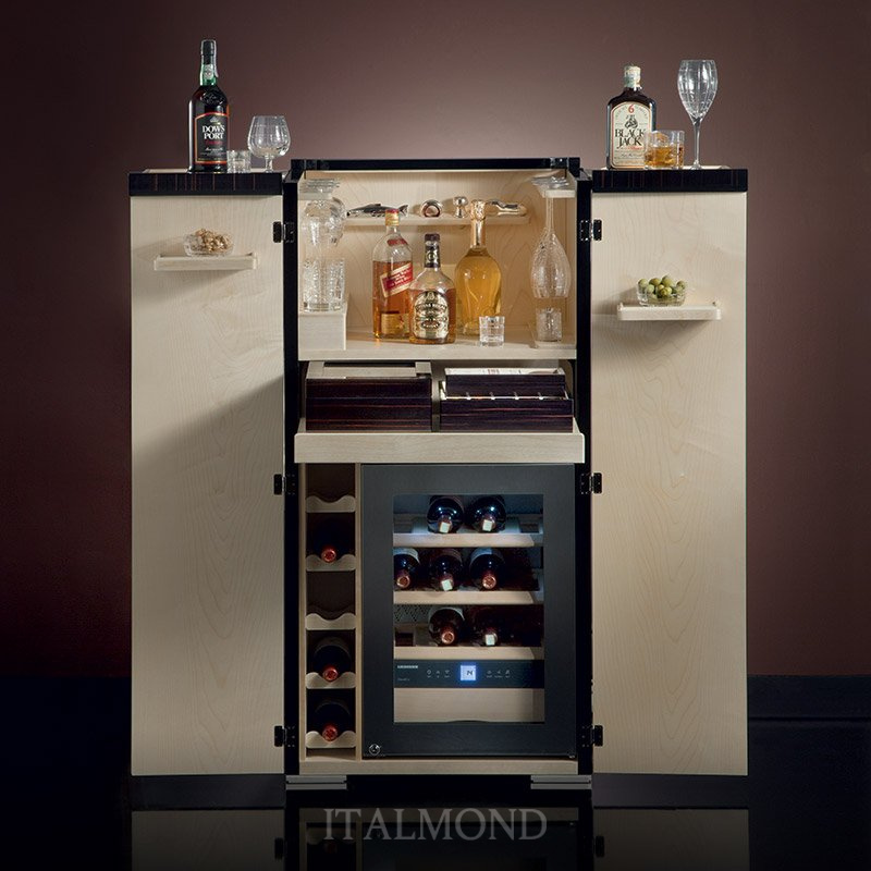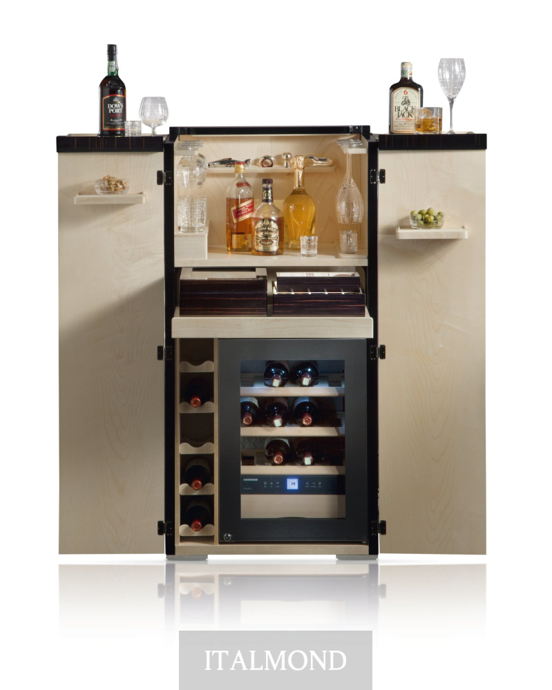 - Цвет и декор:Шкаф-бар с двумя фронтальными дверками и крышкой, которые полностью открываются. Бар содержит: климатизированный винный погреб LIEBHERR для 12 бутылок с температурой от +5° до + 20°, набор из 16 хрустальных бокалов квадратной формы, аксессуары для вина. Ящичек внизу содержит выдвижную коробку для хранения 30 сигар, фишки, игральные карты, кости для покера и кожаные стаканы. Cделан из эбенового полированного дерева, внутри он выполнен из клёна.