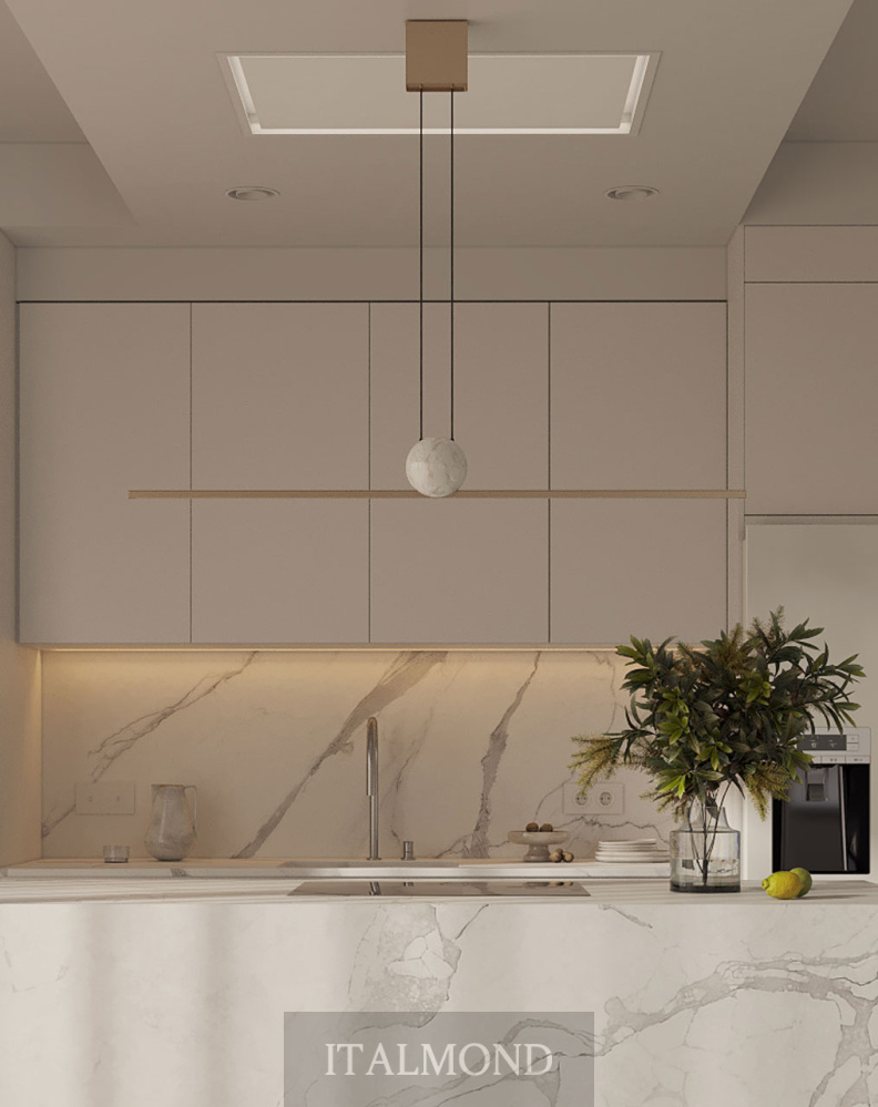 - Цвет и декор:Подвесной светильник с рассеивателем из матового металла цвета Champagne. Декоративный элемент из золотистого мрамора Calacatta.