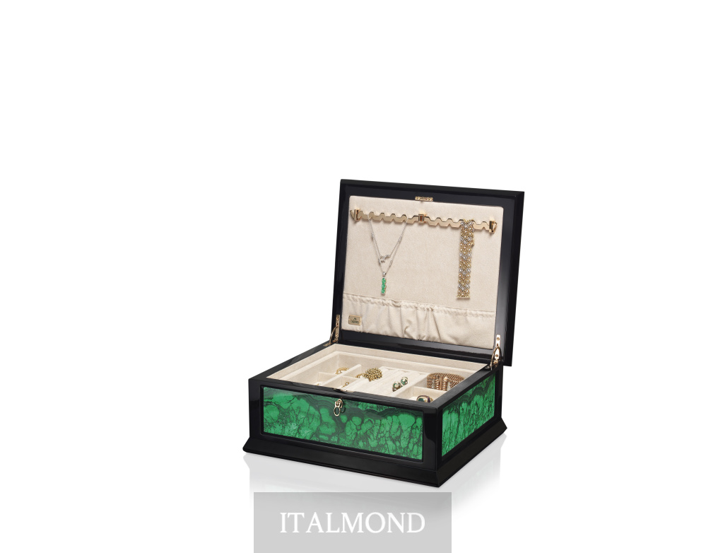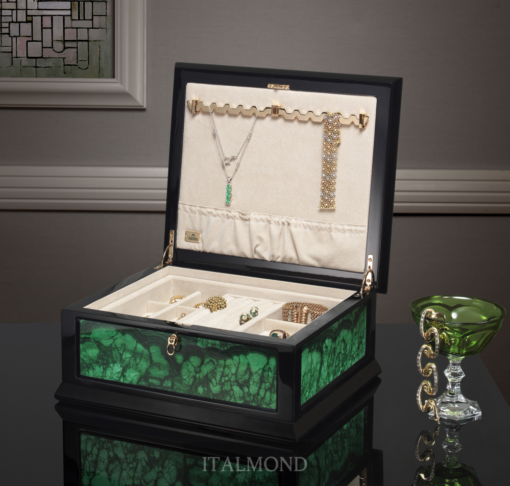 - Цвет и декор:Шкатулка для хранения драгоценностей белая полированная со вставками из малахита. Аксессуары из латуни, покрытые тонким слоем 24-каратного золота