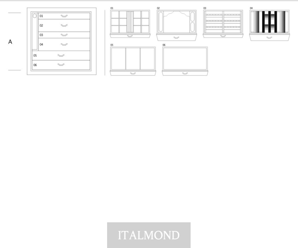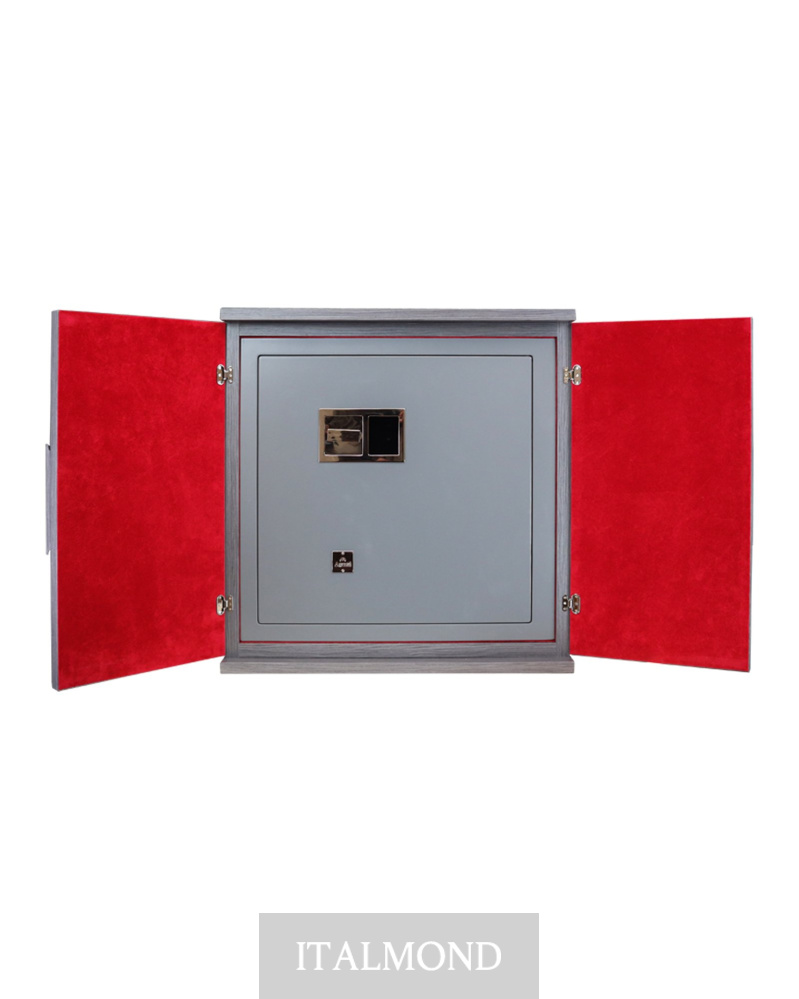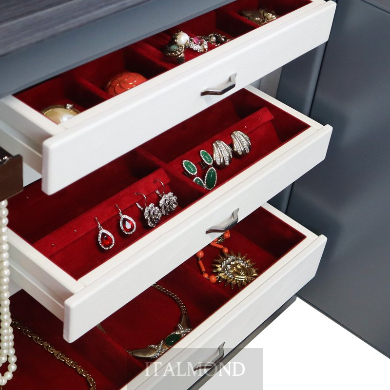 - Цвет и декор:Cейф для хранения драгоценностей из дымчатосерого дуба в матовой отделке, с выдвижными приспособлениями для бус и цепочек. Aксессуары из рутения. Ящики в отделке из белой кожи, внутренняя отделка из красной ультразамши. Сейф внутри дымчатосерый матовый.