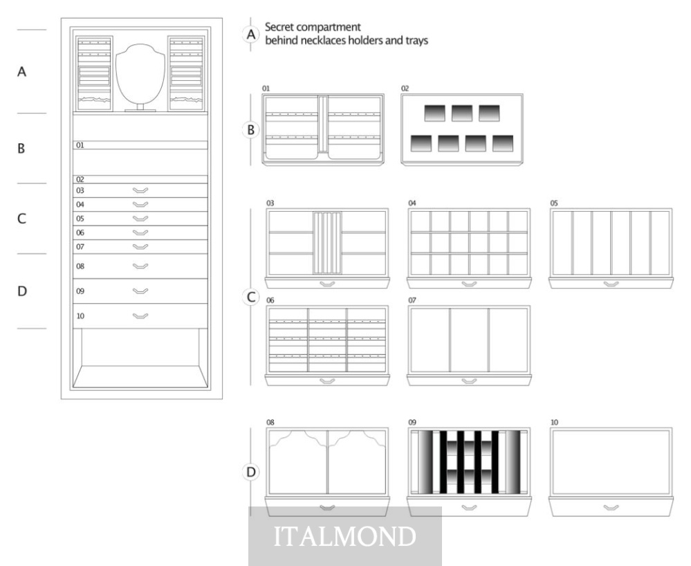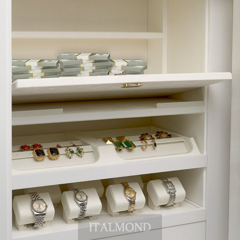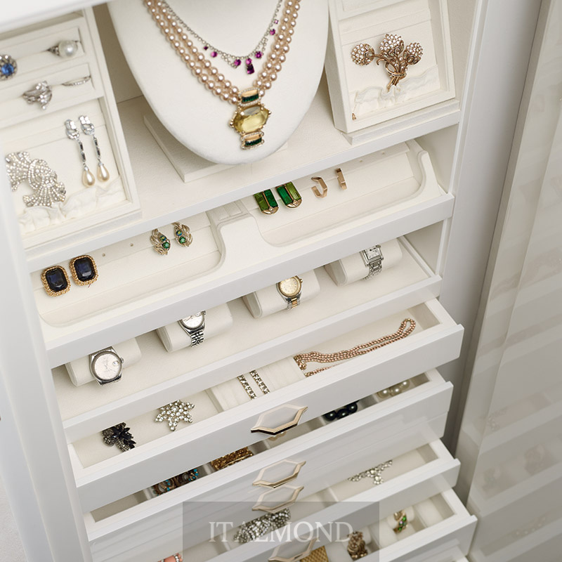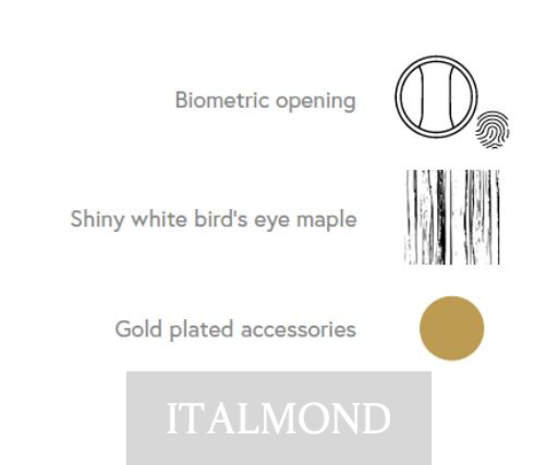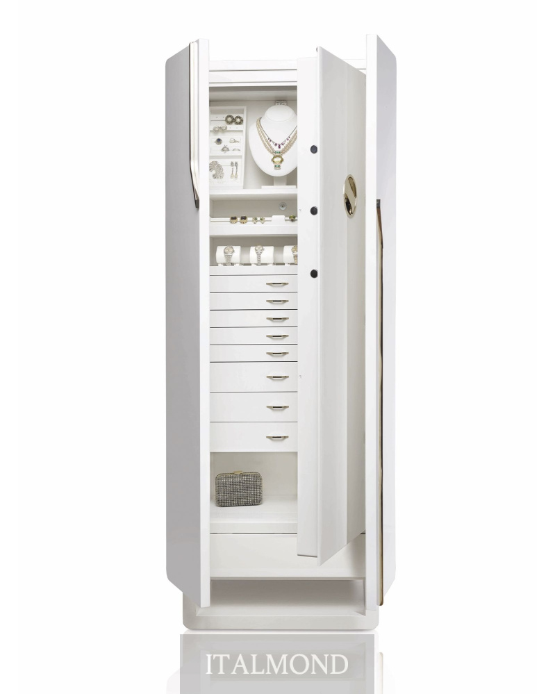 - Цвет и декор:Бронедверной шкаф для украшений из высококачественного глянцевого белого клена с глазковым рисунком, с аксессуарами из латунь, покрытой 24-каратным золотом. Сейф открывается с помощью интегрированной круглой ручки с биометрическим считывателем и аварийным ключом, обеспечивая безопасность и удобство. Работает от батарей, предлагая функциональное и безопасное решение. В верхней части находится манекен для ожерелий и съемные лотки для украшений, обтянутые мягкой замшевой тканью, что гарантирует аккуратную организацию. Секретное отделение скрыто сзади для дискретного хранения. Ящики с передней отделкой из глянцевого белого клена предназначены для хранения украшений, а внутри они обтянуты белой замшевой тканью для нежной и безопасной защиты.