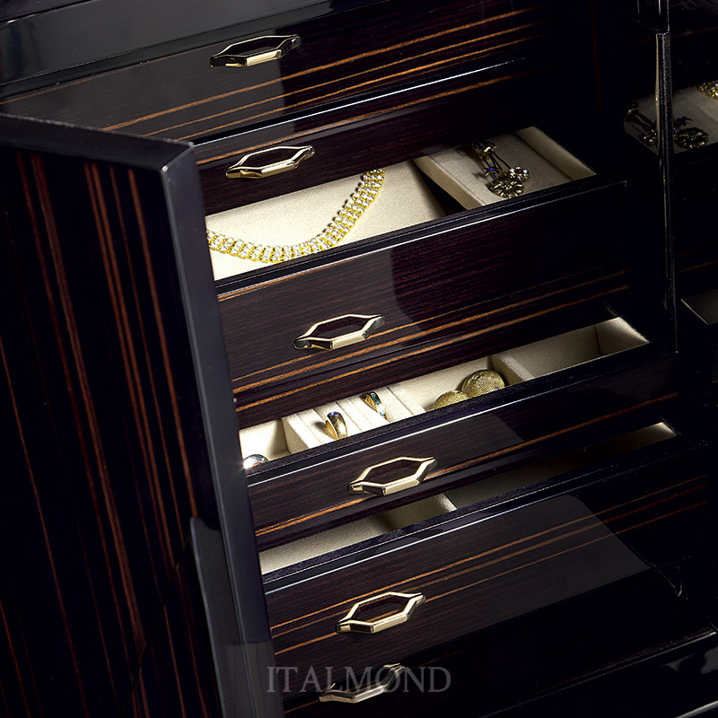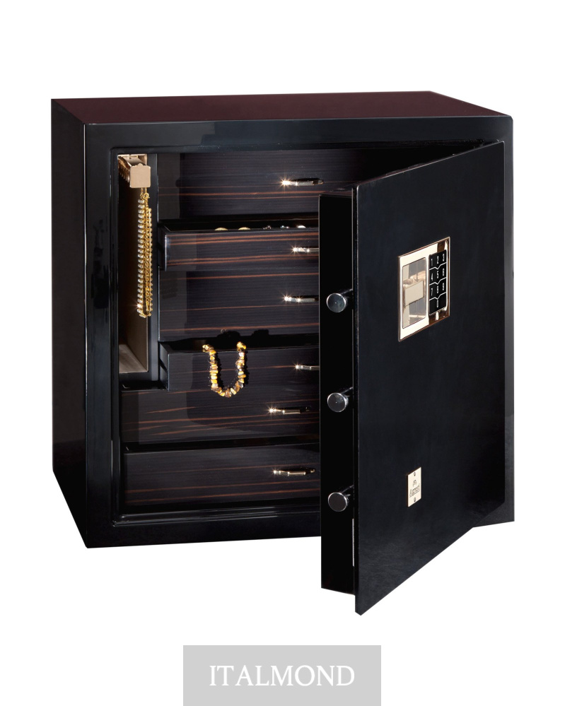 - Цвет и декор:Роскошный сейф для ювелирных изделий с глянцевой черной отделкой со всех четырёх сторон, разработан с учётом эстетики и функциональности. Открытие осуществляется с помощью сенсорной цифровой клавиатуры, питание от батареек. Внутреннее пространство оформлено выдвижными ящиками из глянцевого эбена, обито бежевой замшей, с фурнитурой из латуни, покрытой 24-каратным золотом. Выдвижной держатель для колье обеспечивает безупречный порядок. Предусмотрена установка подзаводчиков часов швейцарского производства. Каждый элемент может быть полностью персонализирован: отделка, материалы и внутренняя конфигурация адаптируются под любые эстетические и функциональные требования.