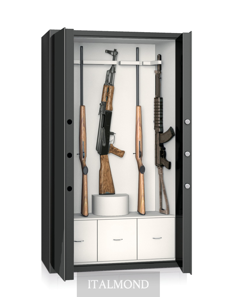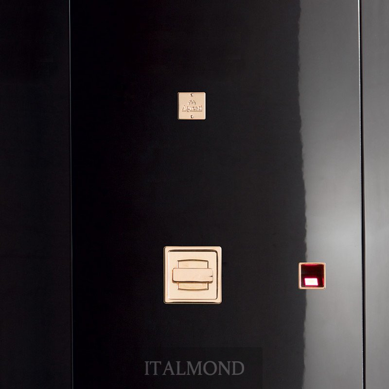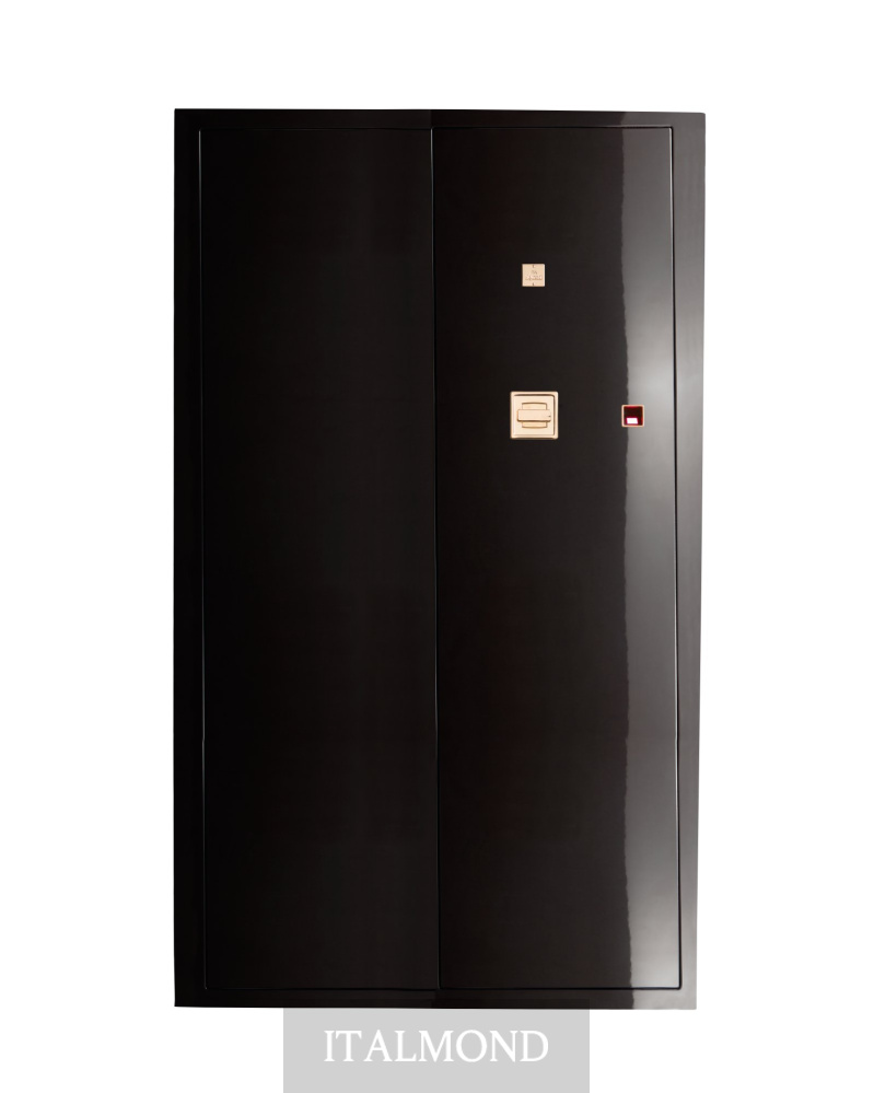 - Цвет и декор:Сейф стальной чёрный полированный. Ящички внутри сделаны из полированного чёрного клёна, аксессуары выполнены из латуни, покрытой тонким слоем золота в 24 карата.
