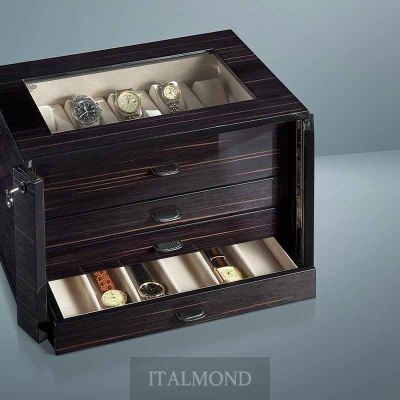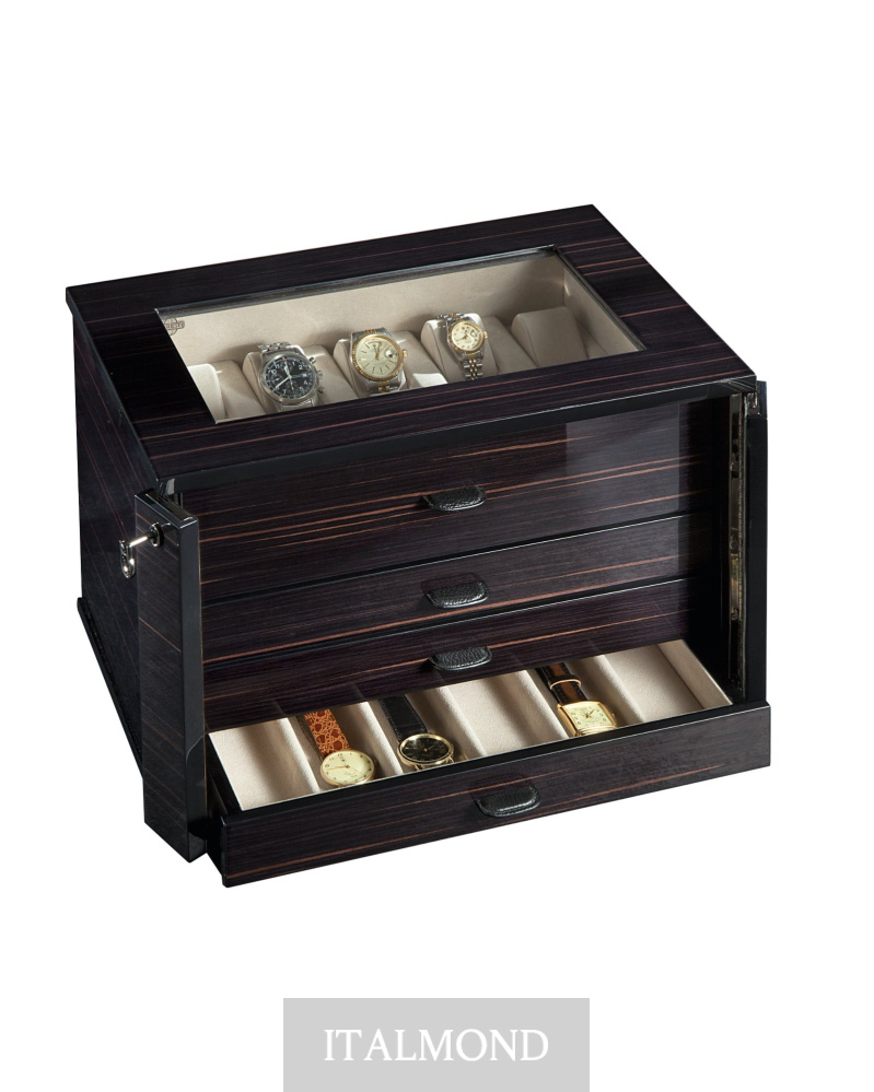 - Цвет и декор:Комод из полированного эбенового дерева, закрываю- щийся на ключ, для хранения 28 часов на подставках и непосредственно в коробочке.