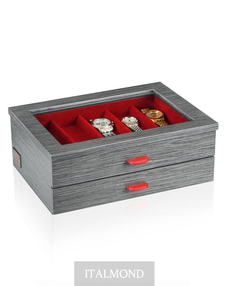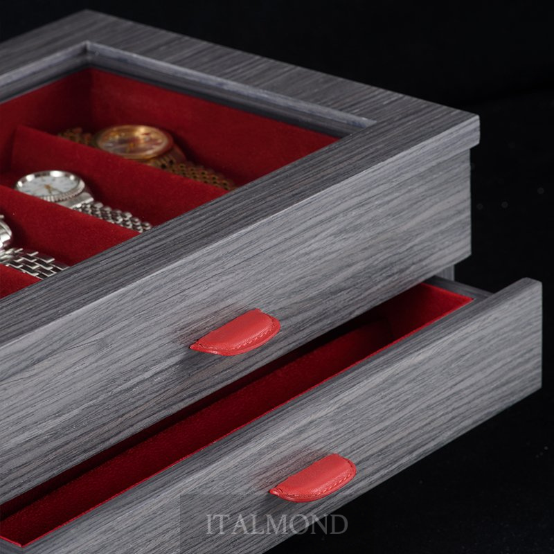 - Цвет и декор:Комод с двумя ящиками для 9 часов из дымчато-серого дуба. Внутренняя отделка из ультразамши красного цвета и ручки из красной кожи.
