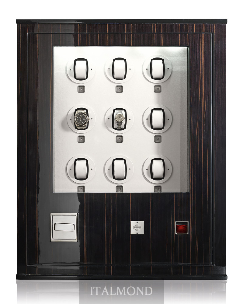 - Цвет и декор:Шкаф из полированного эбенового дерева с сейфом внутри прикрепляется к стене. Биометрический замок и ключ для открытия сейфа во время чрезвычайных ситуаций. Механизмы для подзарядки автоматических часов полностью изготовлены в Швейцарии. Потайное секретное отделение. Внутренняя отделка – мягчайшая замша. Аксессуары выполнены из отделанной рутением латуни. Сейф покрыт полированным эбеновым деревом и чёрной кожей. Пуленепробиваемое стекло (1000 Joule) и защитная система против взлома, девять механизмов для подзарядки автоматических часов, два ящичка и кожаная сумочка для хранения часов во время путешествий.