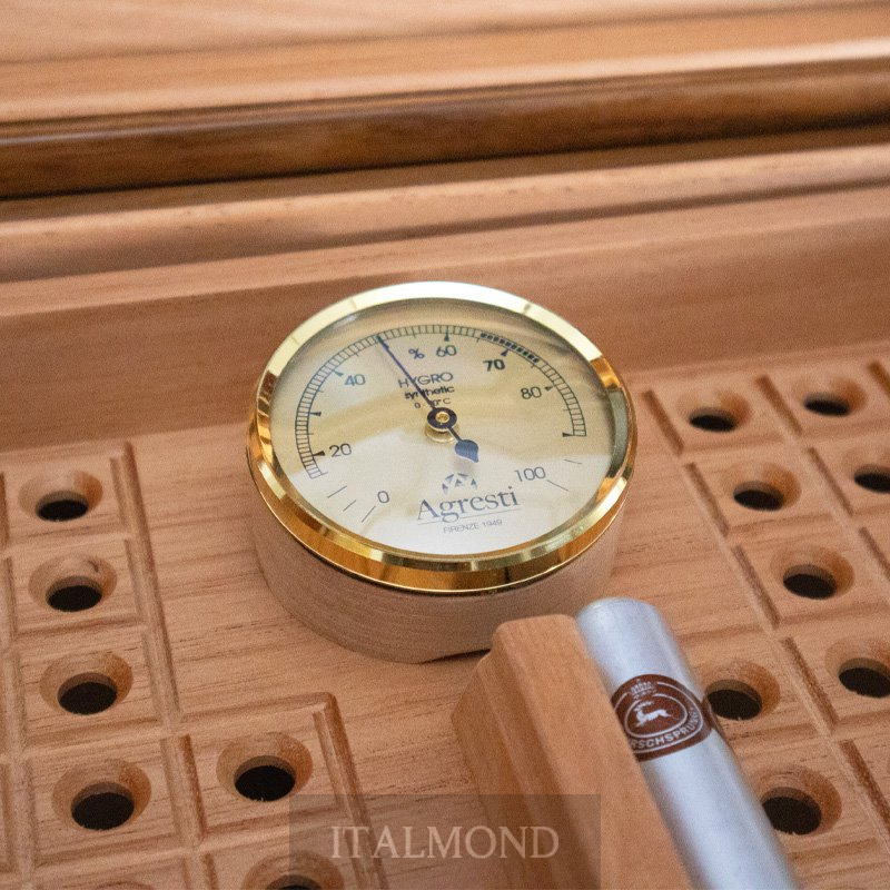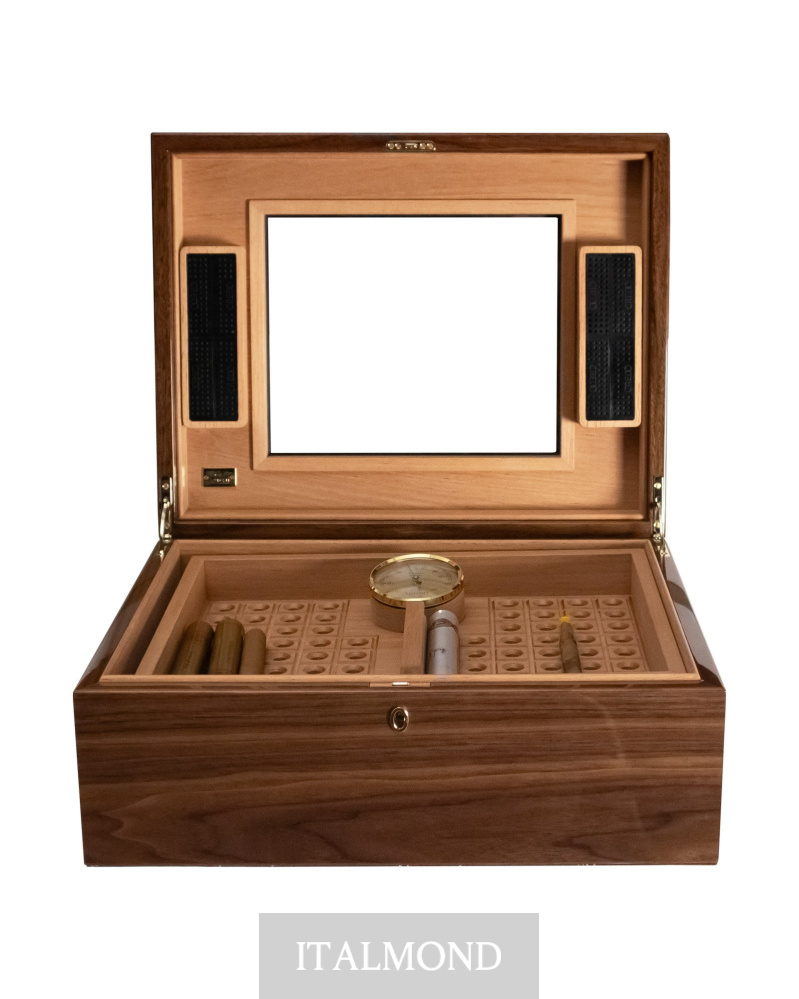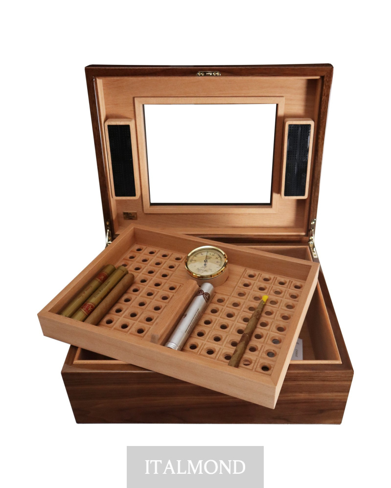 - Цвет и декор:Хьюмидор на 100 сигар из полированного ореха каналетто. Внутри отделка из высококачественного кедра. Два увлажнителя и гигрометр немецкого производства. Съемный поднос с гравированной квадратной текстурой. Защелка с позолоченным покрытием.