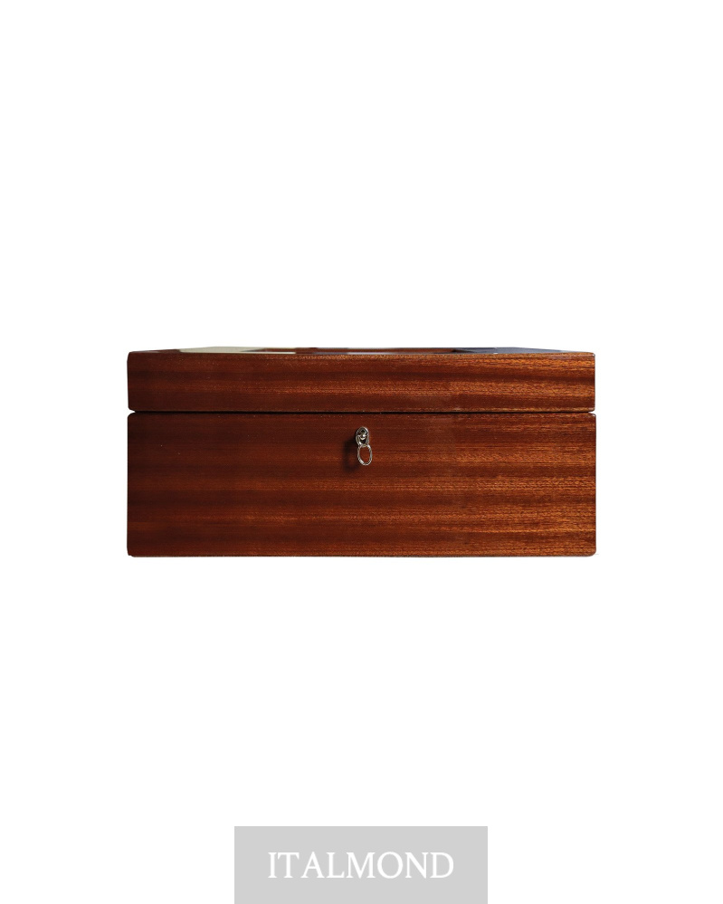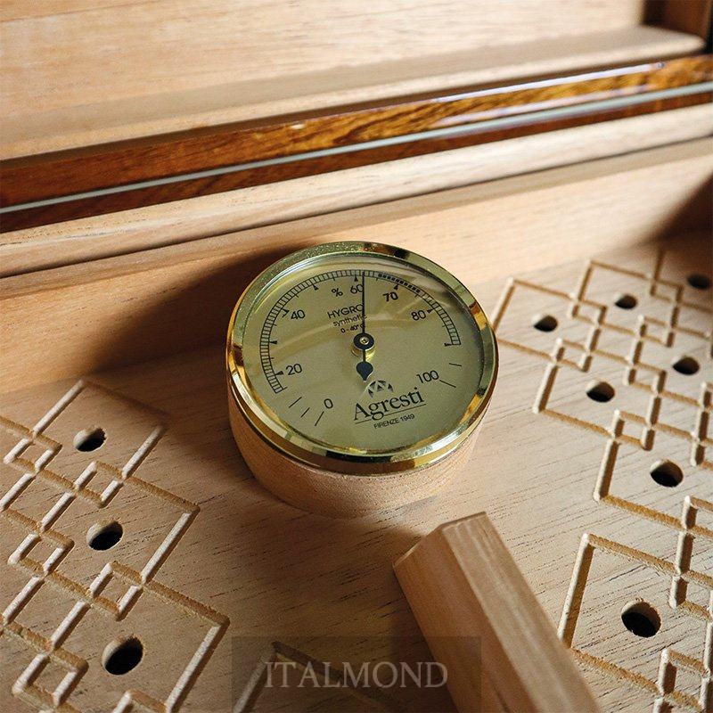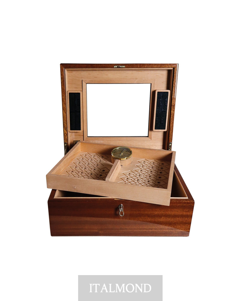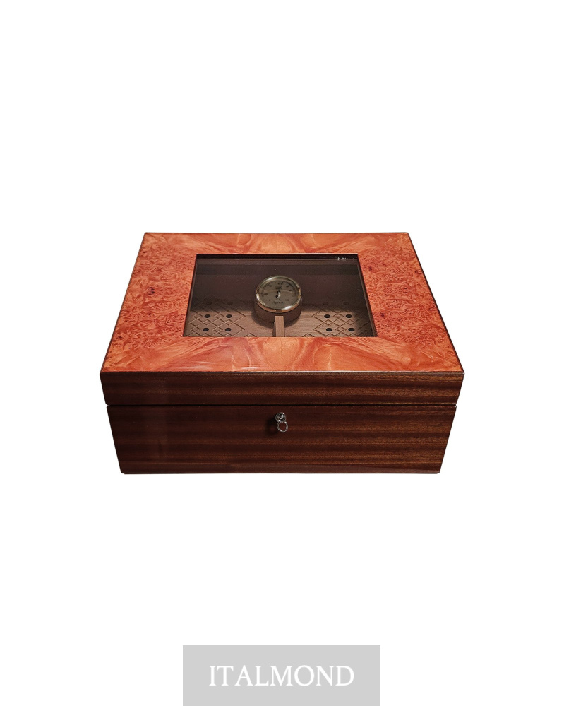 - Цвет и декор:Хьюмидор на 100 сигар из полированной радики и красного дерева. Внутри кедр премиум класса. Два увлажнителя и гигрометр немецкого производства. Съемный поднос с гравированной текстурой. Закрывается замком с позолоченным покрытием.