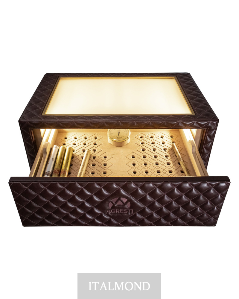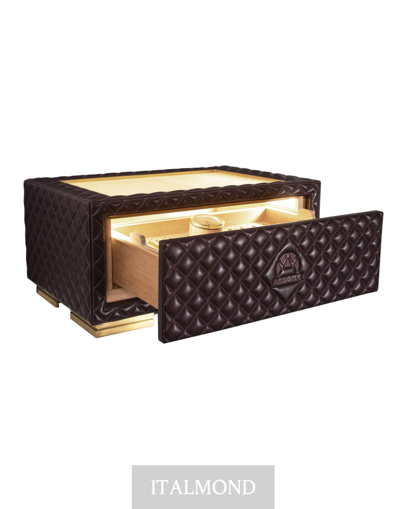 - Цвет и декор:Коробка для сигар, обтянутая мягкой кожей с ручной прострочкой. Внутренняя отделка из массива кедра. Съемный поднос с ромбовидной гравировкой, увлажнителем и гигрометром. Открывается с помощью карты-ключа с RFID-технологией и электрохромным стеклом сверху. Детали из матовой латуни.