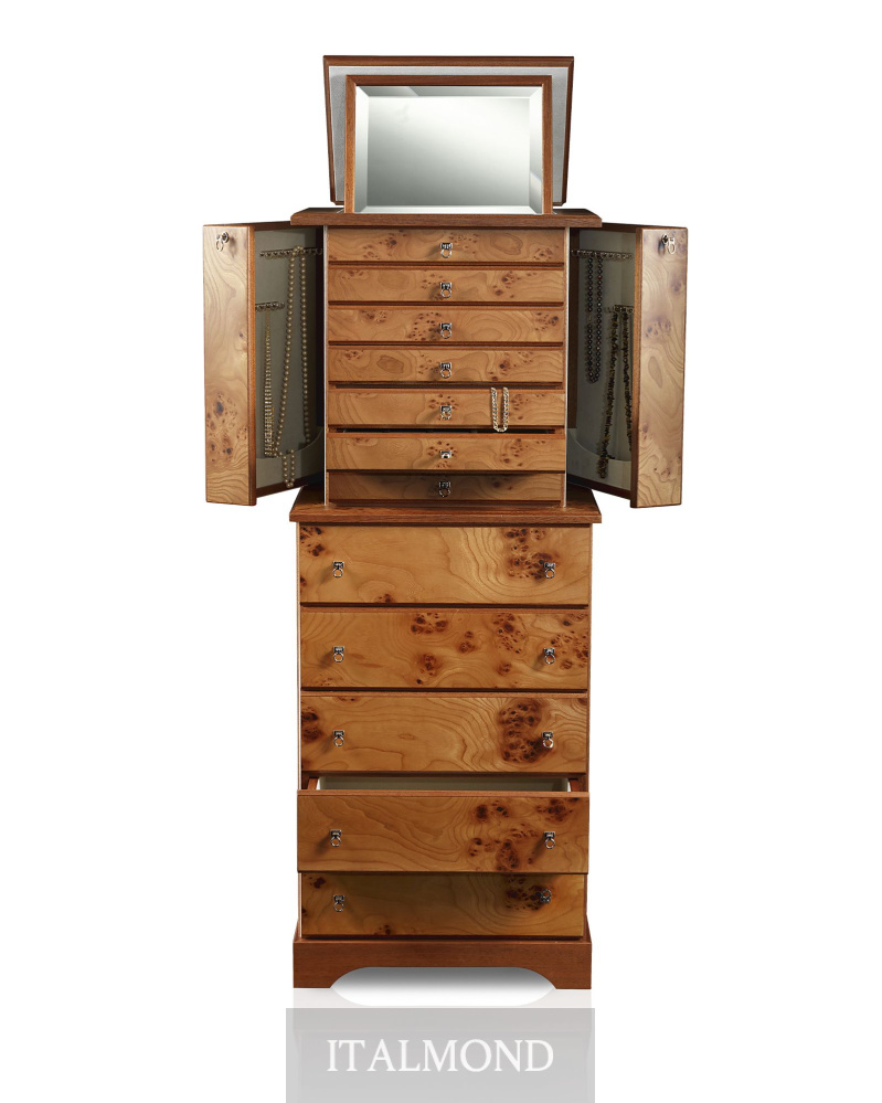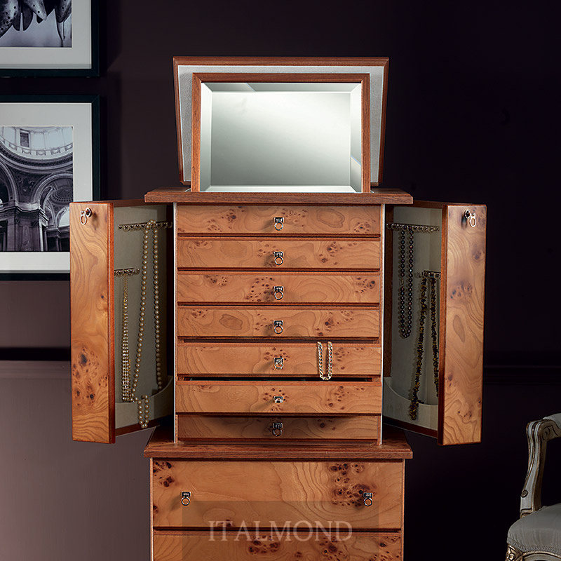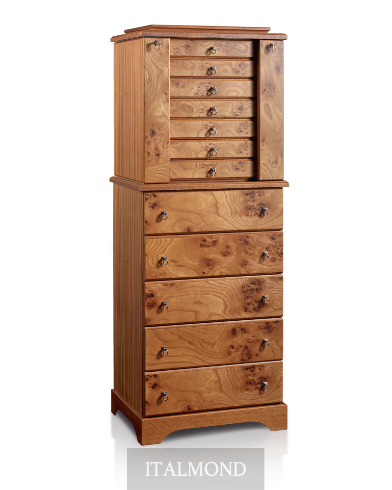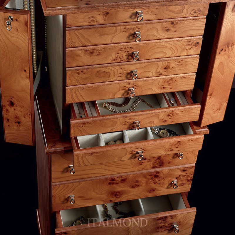 - Цвет и декор:Шкаф для хранения драгоценностей из радики и красного дерева матовой отделки, внутренняя часть выполнена из мягчайшей замши. Аксессуары выполнены из латуни, покрытой тонким слоем золота в 24 карата. Боковые створки шкафа для хранения цепочек различных размеров закрываются на ключ. Шесть верхних ящичков закрываются на ключ, они - различной наполняемости для любого типа драгоценностей. В верхнюю часть вмонтировано регулируемое зеркало, в то время как пять вместительных ящиков в нижней части шкафа можно использовать для хранения шарфов, белья, личных вещей.