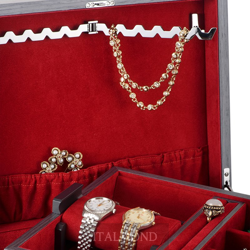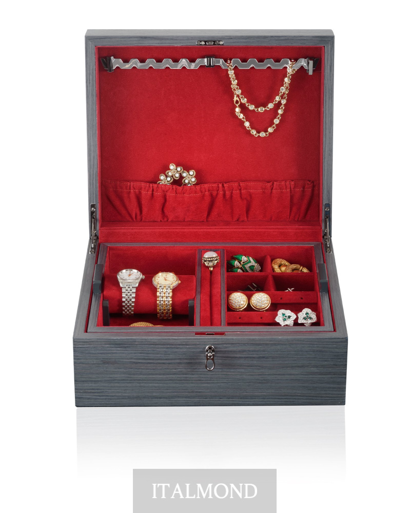 - Цвет и декор:Шкатулка для украшений со съемным лотком, закрывается на ключ, имеет отделения для серег, колец, ожерелий. Дымчато-серый дуб, внутренняя отделка из красной ультразамши.