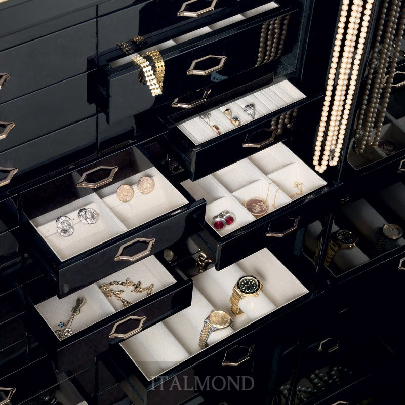 - Цвет и декор:Сейф стальной чёрный полированный для хранения драгоценностей с выдвижными приспособлениями для бус и цепочек. Ящички внутри сделаны из полированного чёрного клёна, аксессуары выполнены из латуни, покрытой тонким слоем золота в 24 карата.