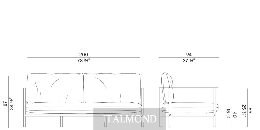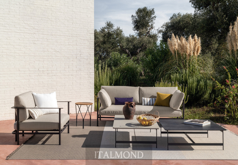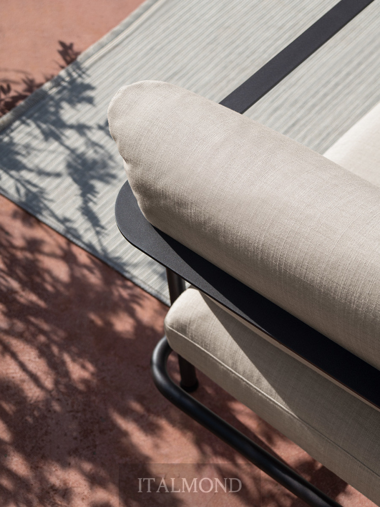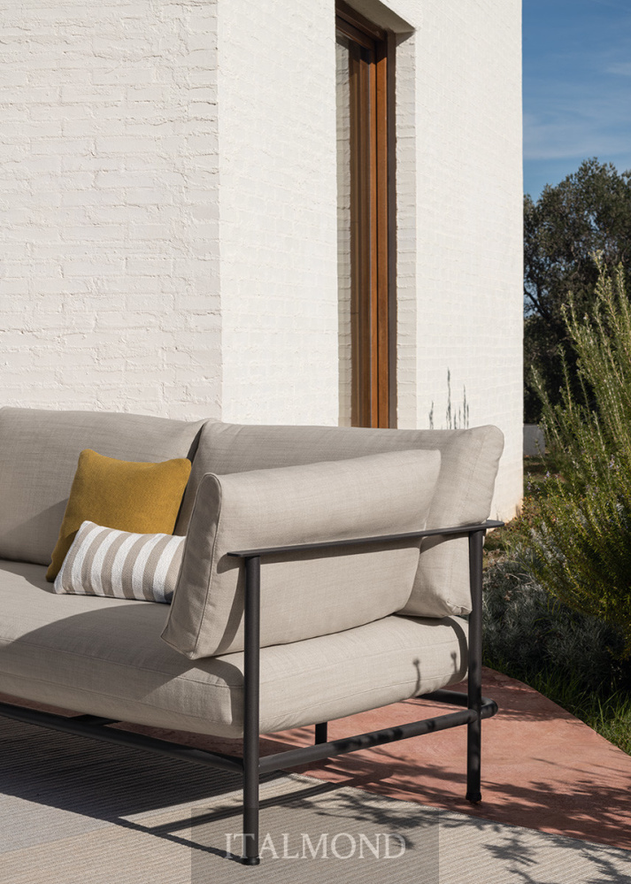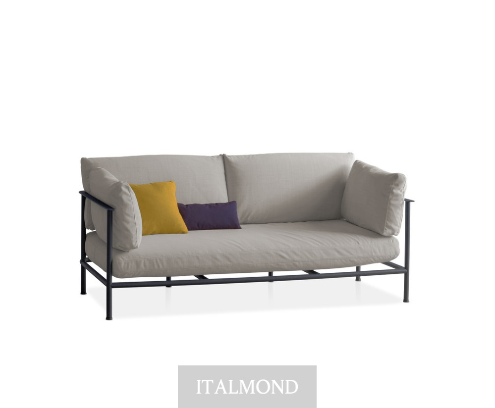 - Цвет и декор:Диван Elodie отличается лаконичной открытой конструкцией из тисненых металлических труб антрацитового или авальского цвета , предназначенной для размещения больших подушек с наполнителем из огнестойкого пенополиуретана, которые опираются на плоский металлический профиль, проходящий по всему периметру поддерживающих подушек. Отличительной деталью является подушка сиденья , которая благодаря специальным опорам словно отсоединяется от конструкции, создавая ощущение подвешенности.
