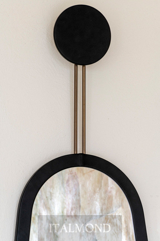 - Цвет и декор:тот оригинальный предмет мебели отличается изысканной отделкой: профиль зеркала и круглая крепежная часть обтянуты кожей в цветах коллекции, а два металлических стержня выполнены из бронзированной латуни.