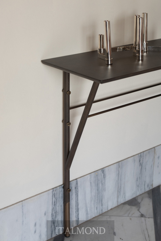 - Цвет и декор:Настенная консоль Wood_Y отличается конструкцией и столешницей из ясеня с рейками и деталями в виде головок винтов с отделкой под бронзовую латунь.