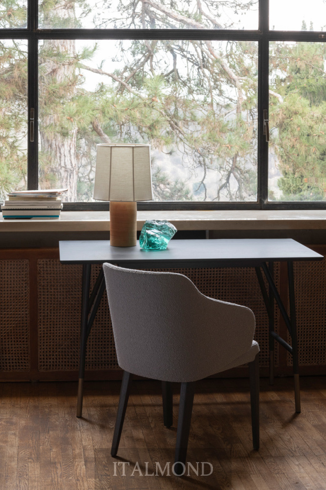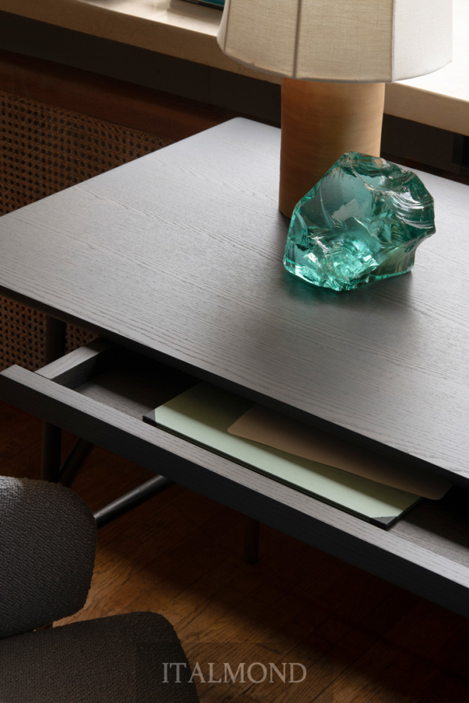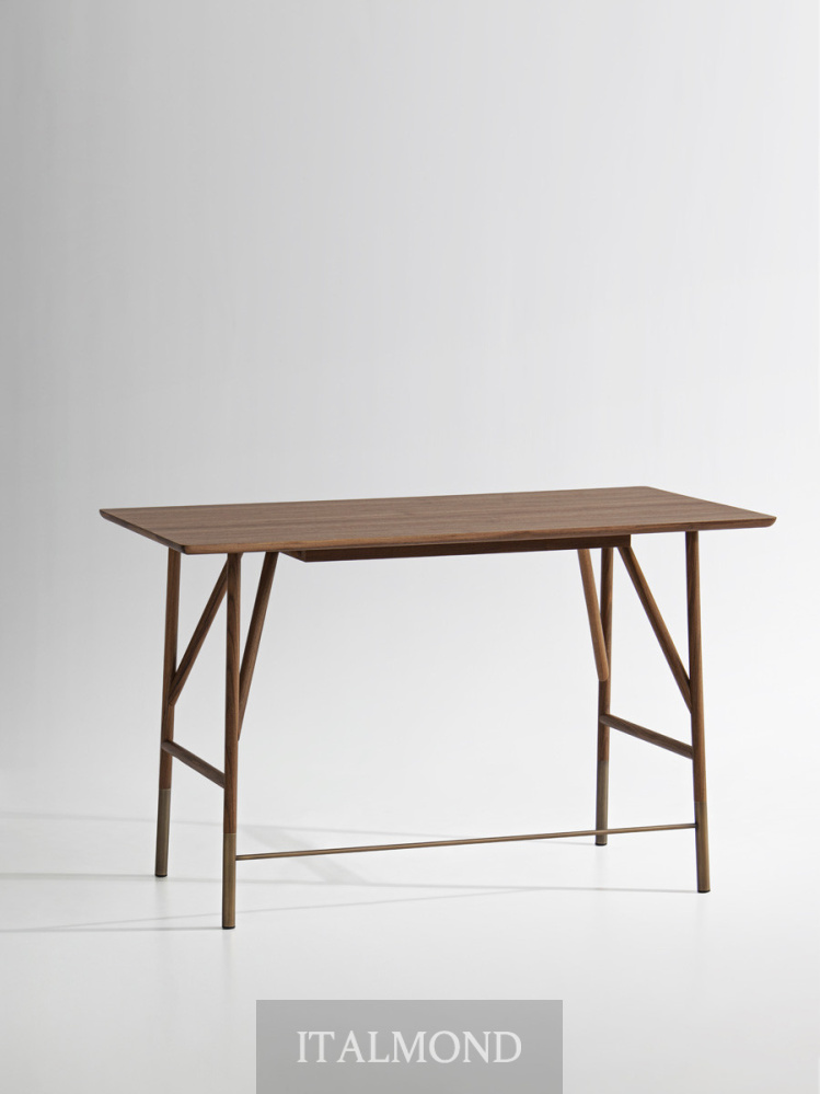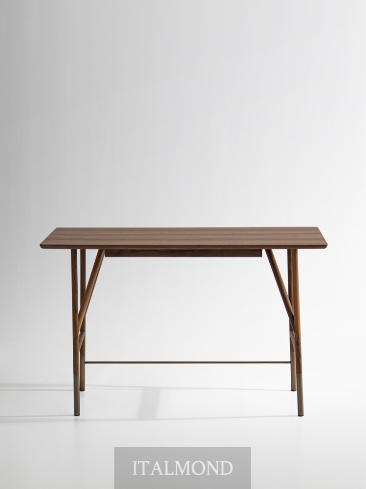 - Цвет и декор:Письменный стол имеет каркас из ясеня, выполненный в отделке, соответствующей коллекции, с металлическими стержнями и деталями в виде головок винтов с бронзовым латунным покрытием. В качестве опции к письменному столу предлагается выдвижной ящик под столешницу в той же отделке, что и сам предмет мебели.