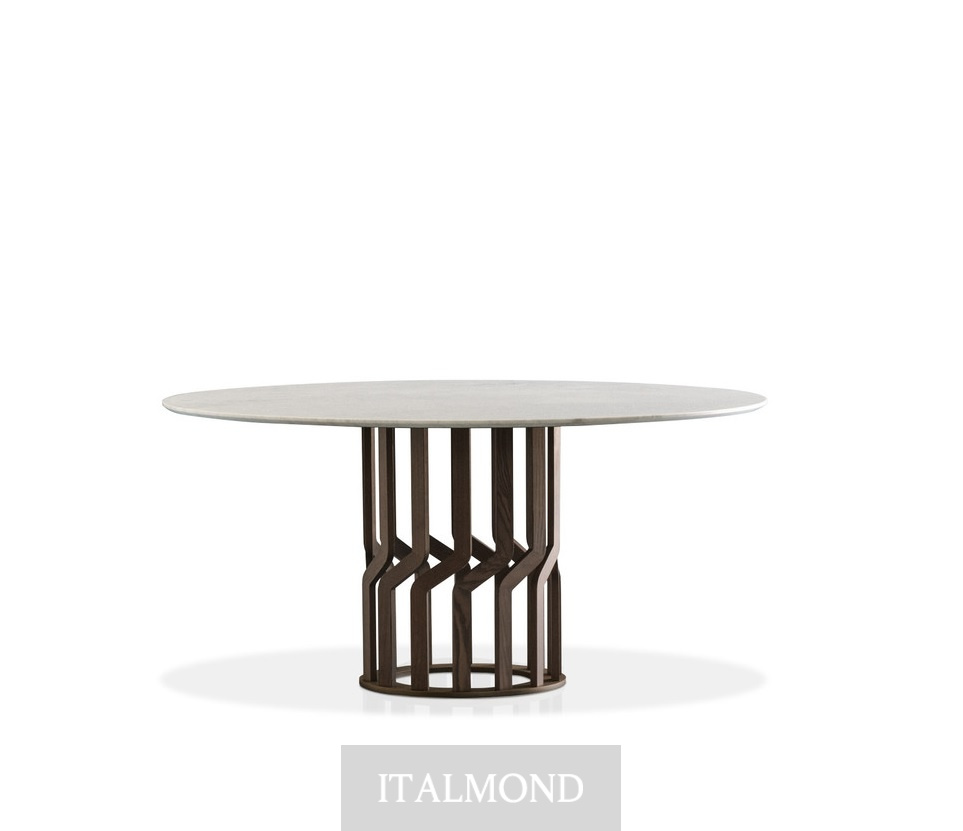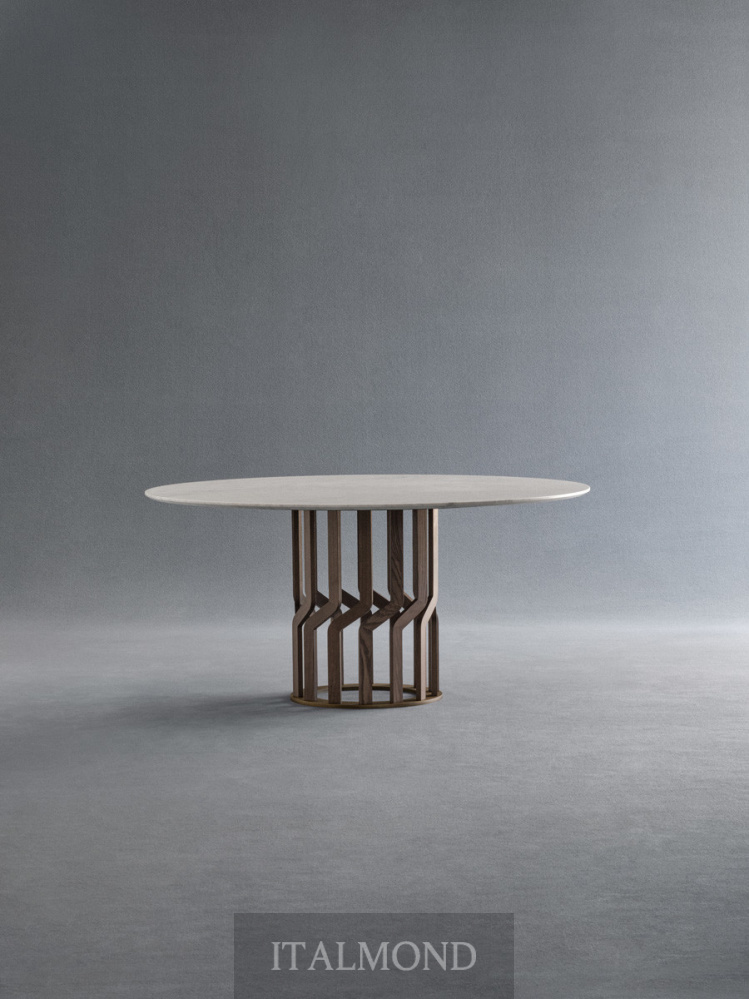 - Цвет и декор:Стол состоит из центрального основания, выполненного из 14 фигурных элементов из массива ясеня, которые, кажется, соприкасаются друг с другом. На них покоится круглая столешница, доступная в фиксированном варианте из мрамора, в отделке, соответствующей коллекции.