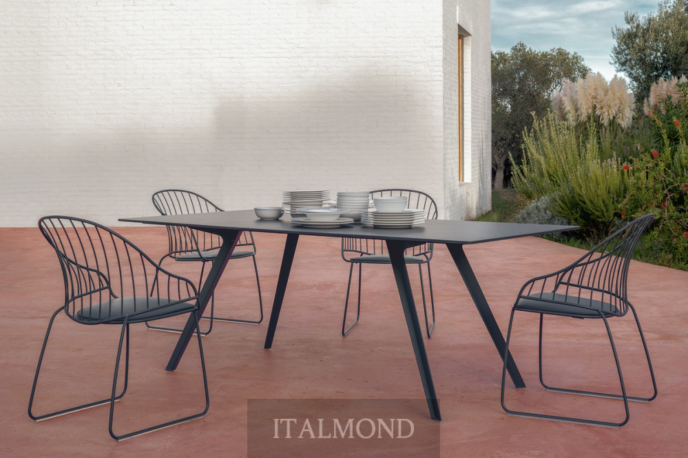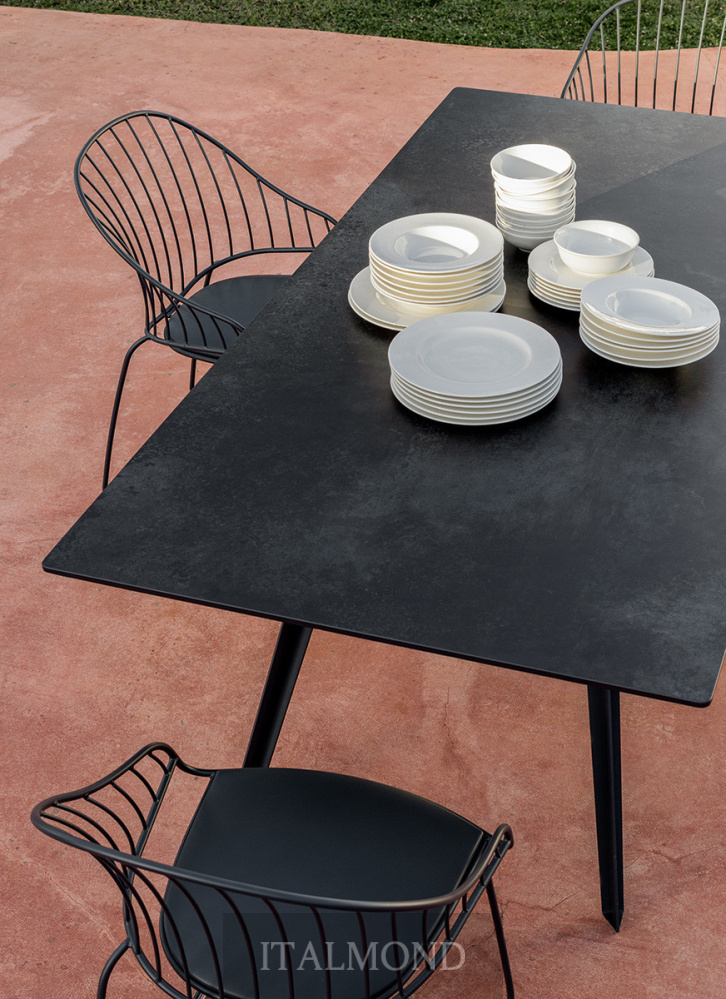- Цвет и декор:Katana — это стол, разработанный для использования как в домашних интерьерах, так и на открытом воздухе. Он предлагается в варианте с четырьмя ножками из тисненого окрашенного металла и прямоугольной столешницей из ламинированного фарфора или HPL , в отделке, соответствующей коллекции.
