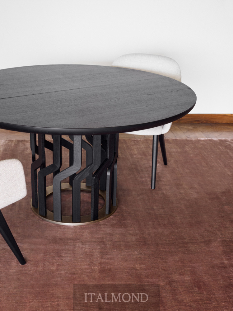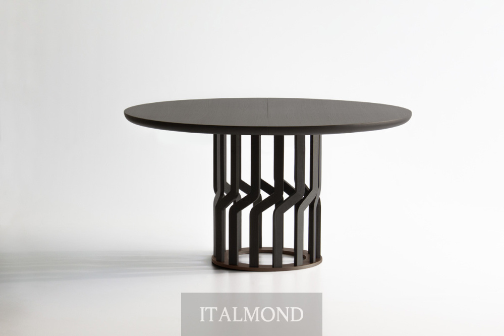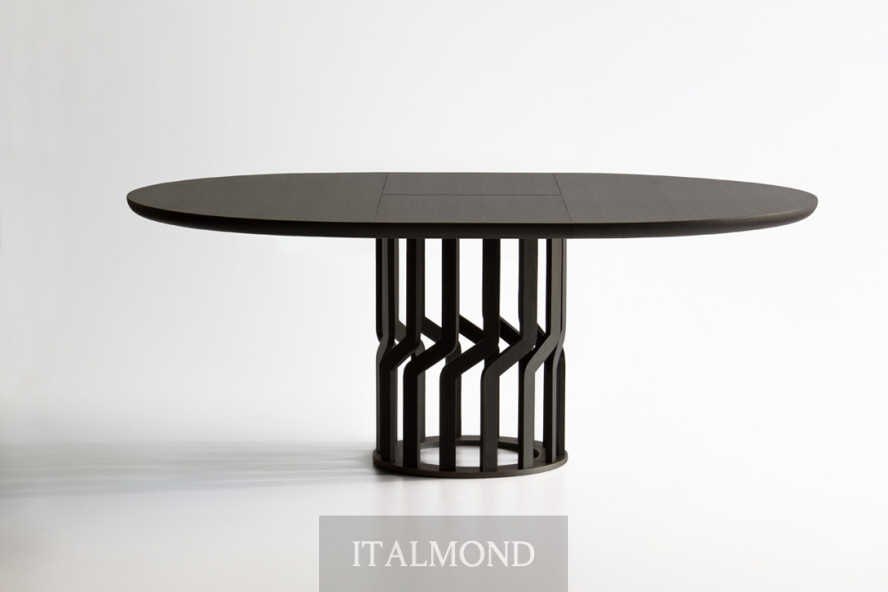 - Цвет и декор:Стол состоит из центрального основания, выполненного из 14 фигурных элементов из массива ясеня, которые, кажется, соприкасаются друг с другом. На них покоится круглая столешница с центральным продолжением.