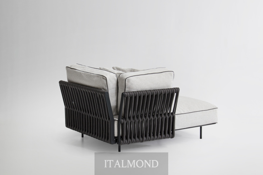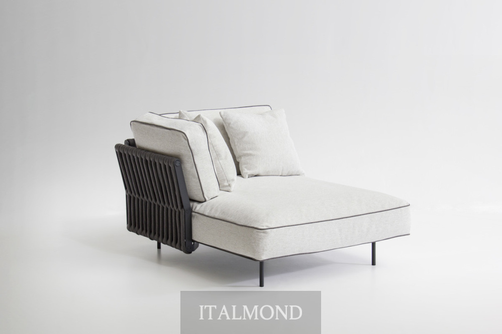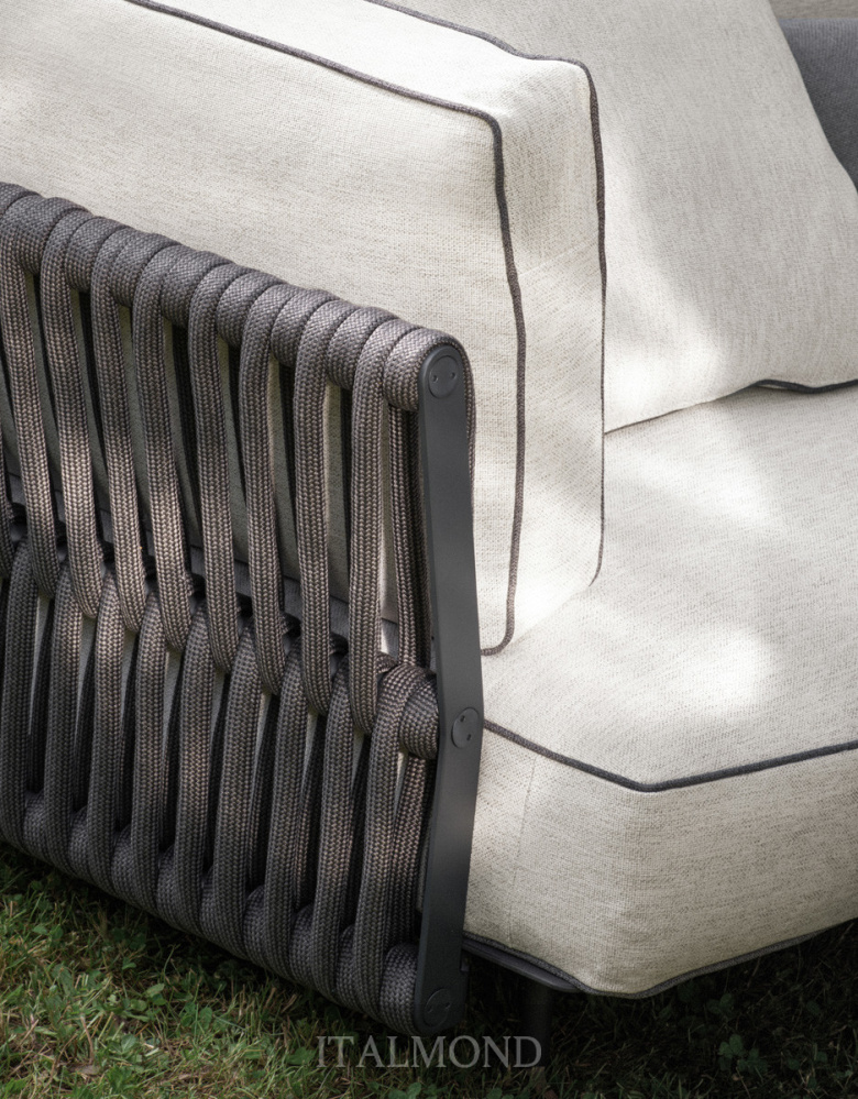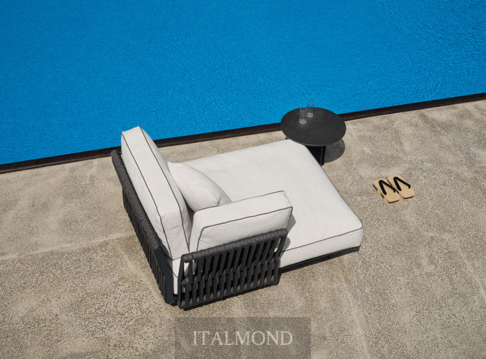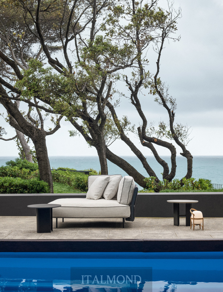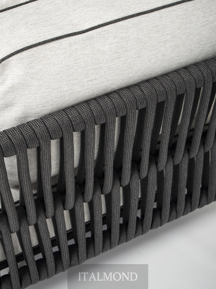- Цвет и декор:Подушки, имеющие мягкую форму, опираются на платформу, создавая объемную набивку при низких пропорциях. Обивка выполнена из тканей для использования на открытом воздухе, соответствующих коллекции, с контрастной окантовкой.