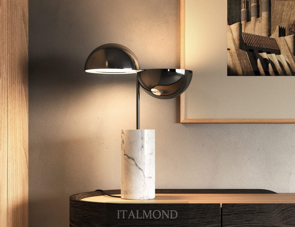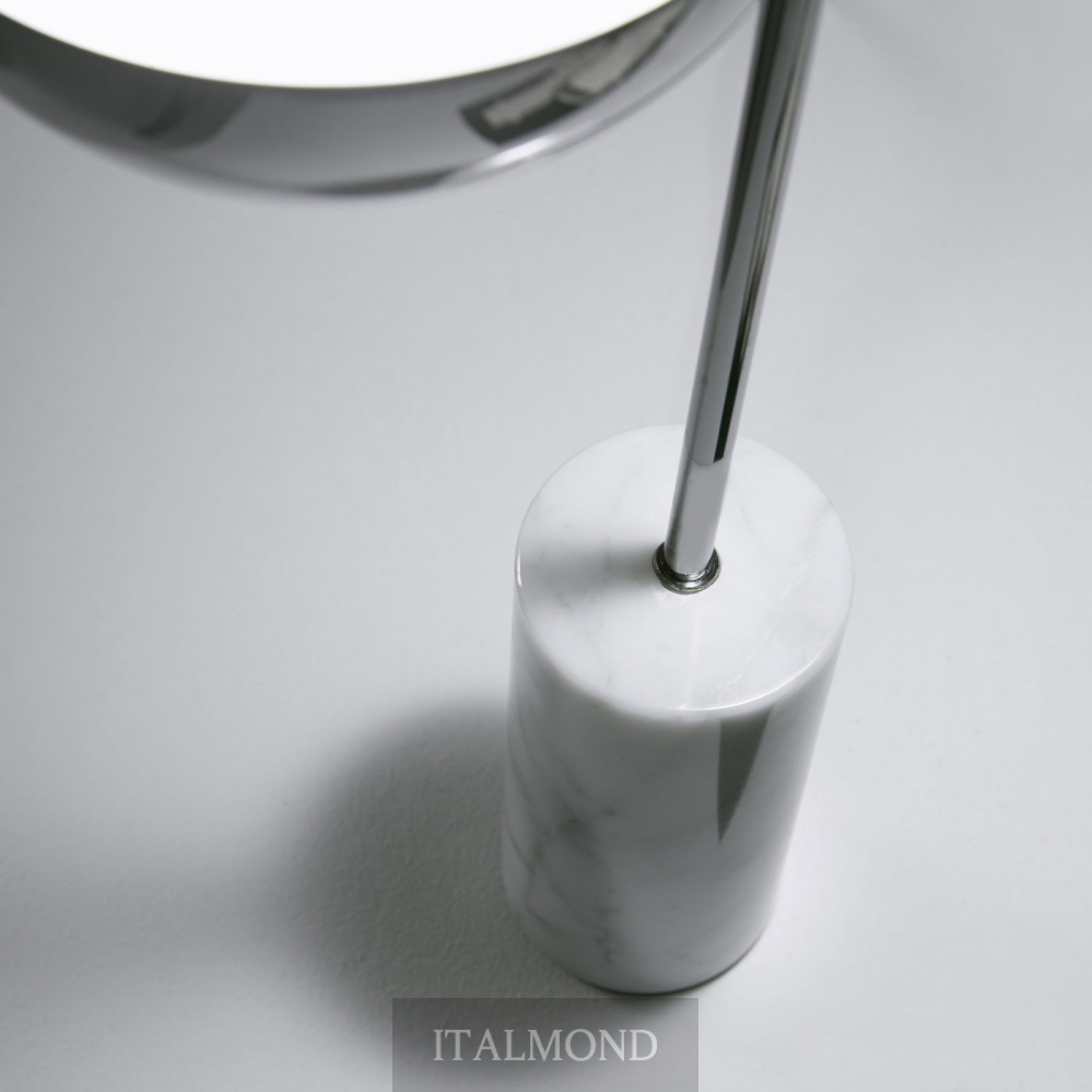 - Цвет и декор:Лампы с каркасом из глянцевого черного хрома. Настольная лампа доступна с основанием из белого мрамора Carrara или металла.