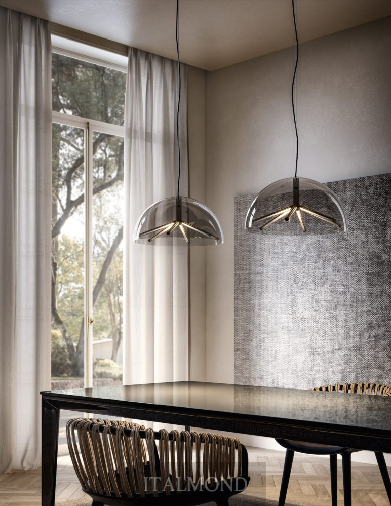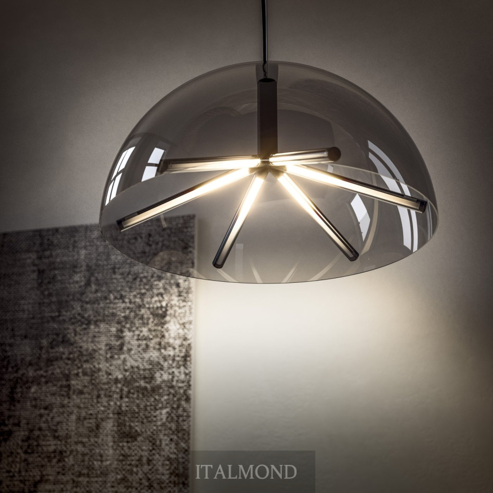 - Цвет и декор:Подвесной светильник с куполообразным абажуром из боросиликатного стекла и конструкцией, состоящей из шести плафонов, обеспечивающих прямое и непрямое освещение. Плафоны покрыты оксидированным боросиликатным стеклом.