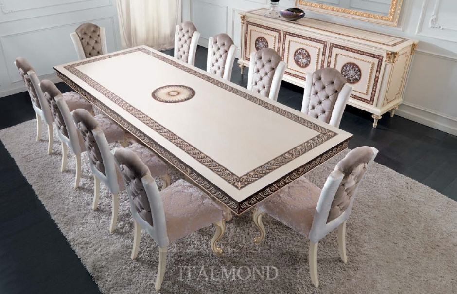 Большой прямоугольный стол из коллекции Dining Rooms от итальянского производителя Ceppi создан для большего богатства выбора: с идентичным орнаментом выпускается также круглый стол. И если в круглом столе "движение" орнамента направлено в противоположные стороны, то здесь идет четкий ритм: на фризе и на столешнице наклон стилизованных ветвей идет в одну сторону, что наверху, то и внизу.