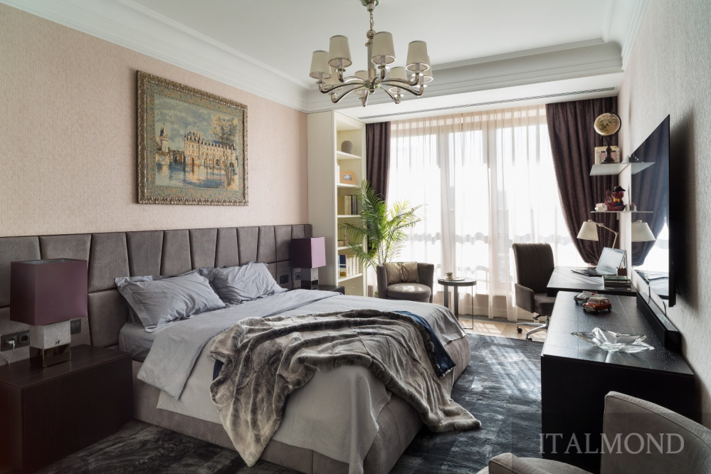 - Кровать с решёткой, тумбочки, кресла, комод, столик у кресла, стулья, ковёр, пуф, прикроватные лампы – фабрика Smania